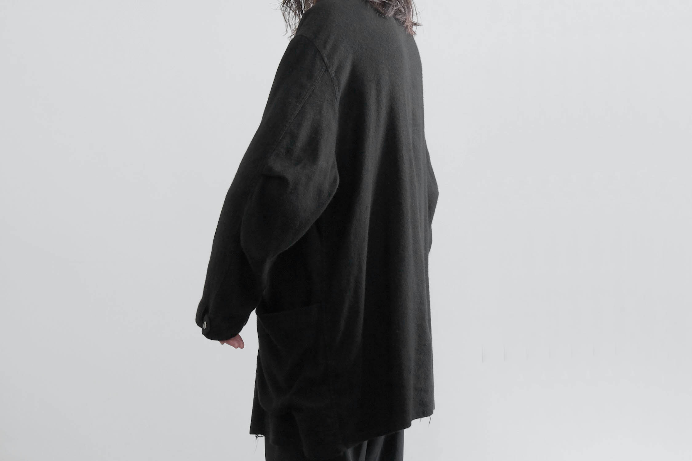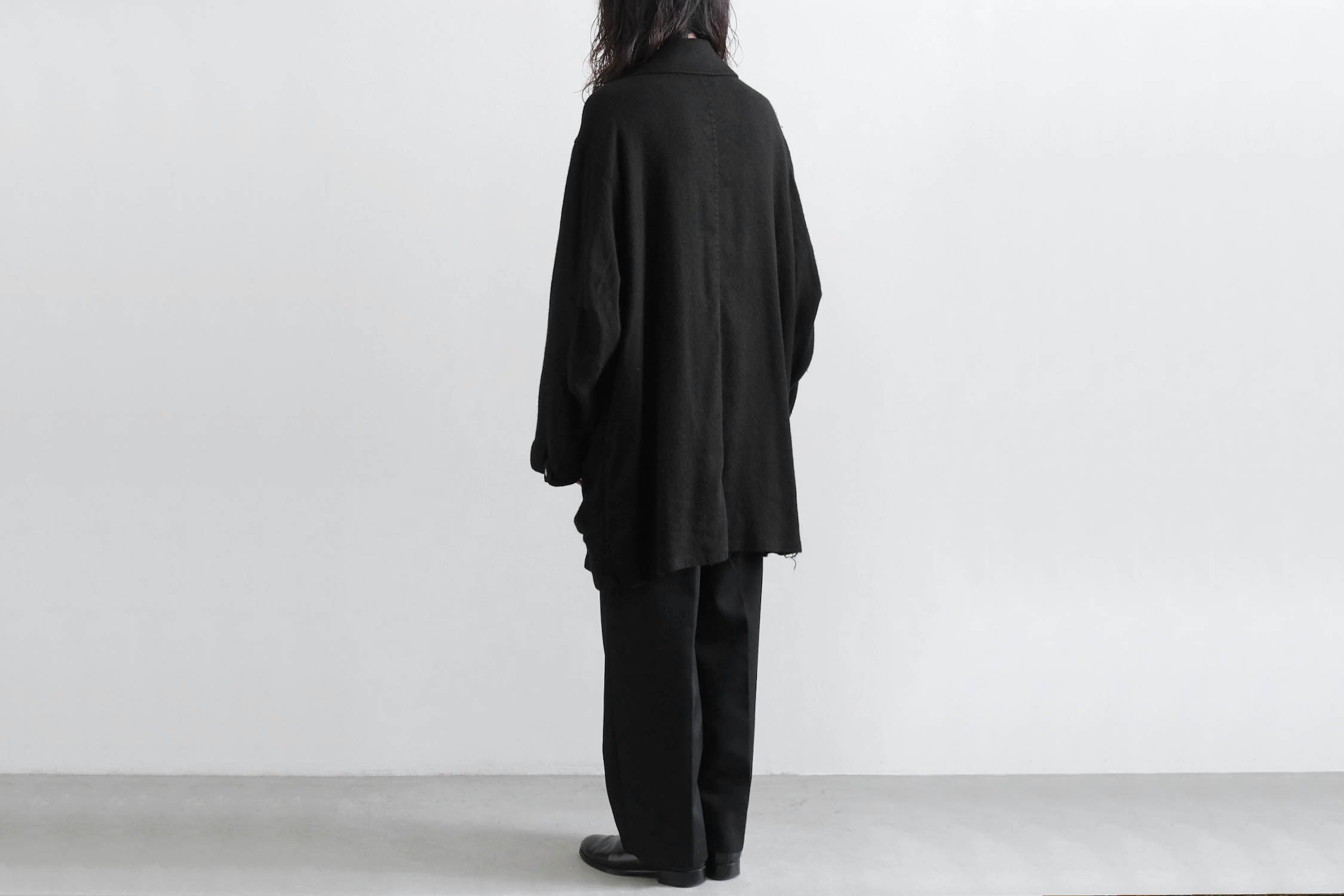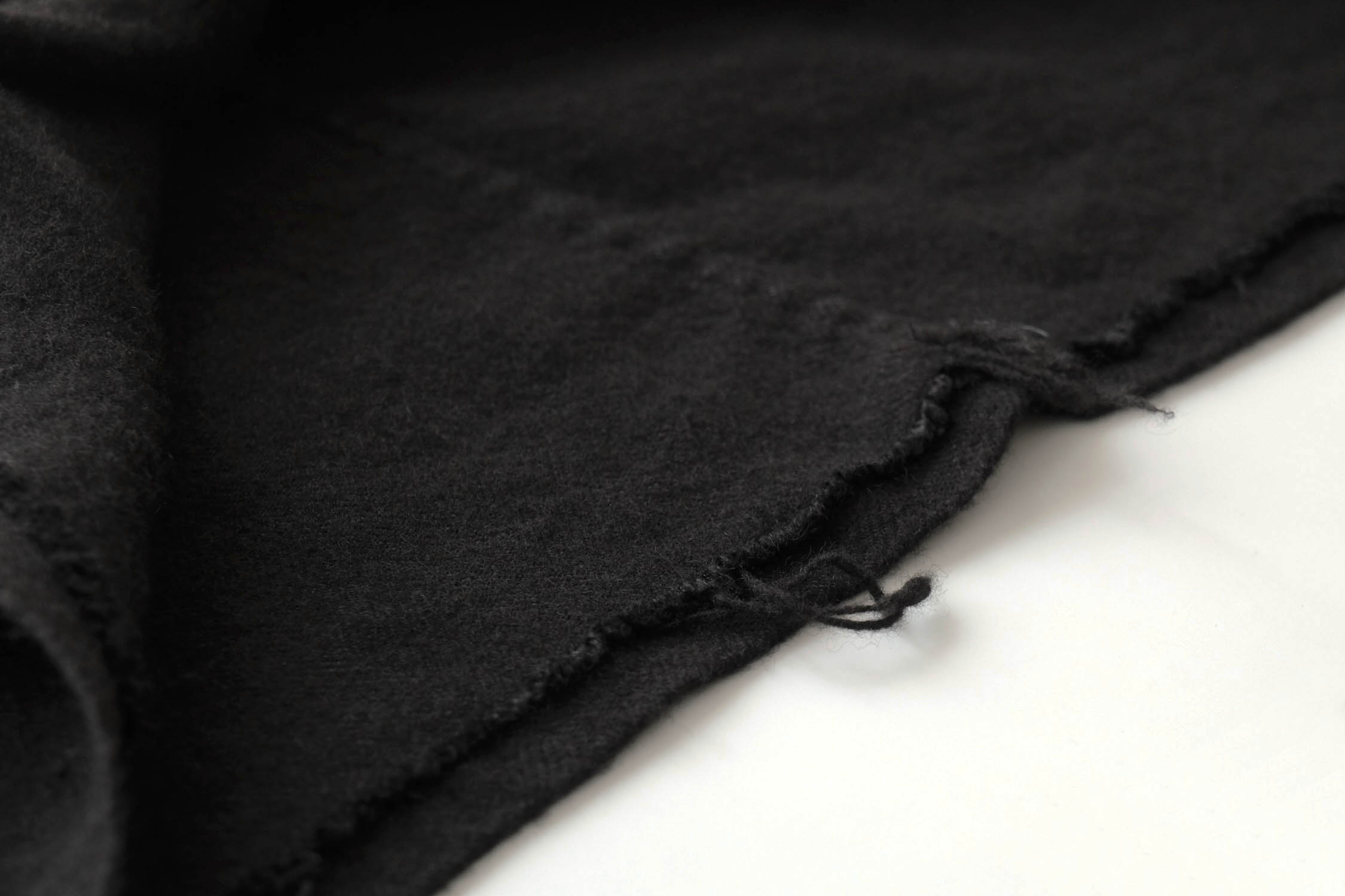 ブラックに染色したカシミヤ糸と無染色のリネン糸で構成された素材にブラックでガーメントダイ。