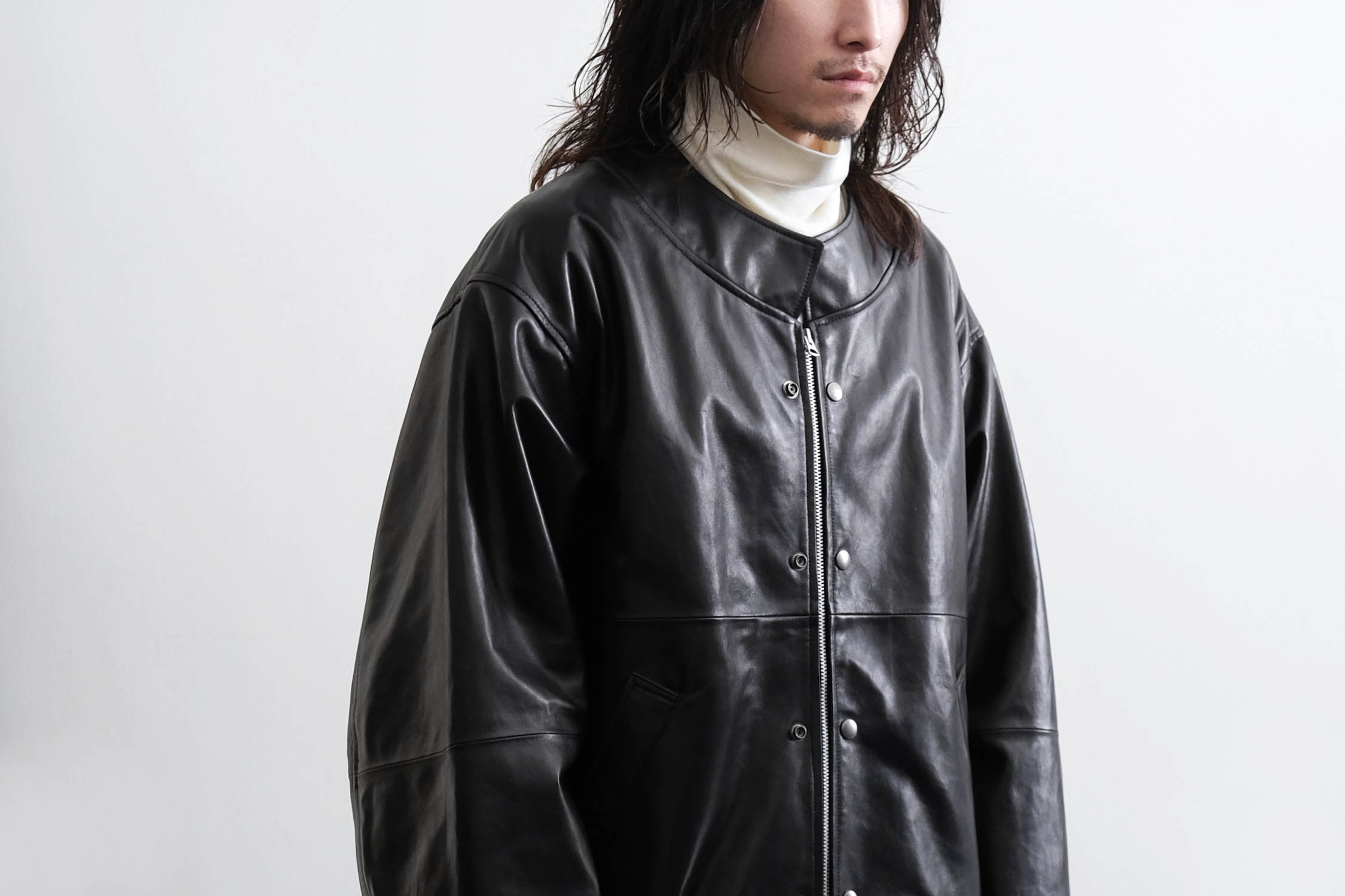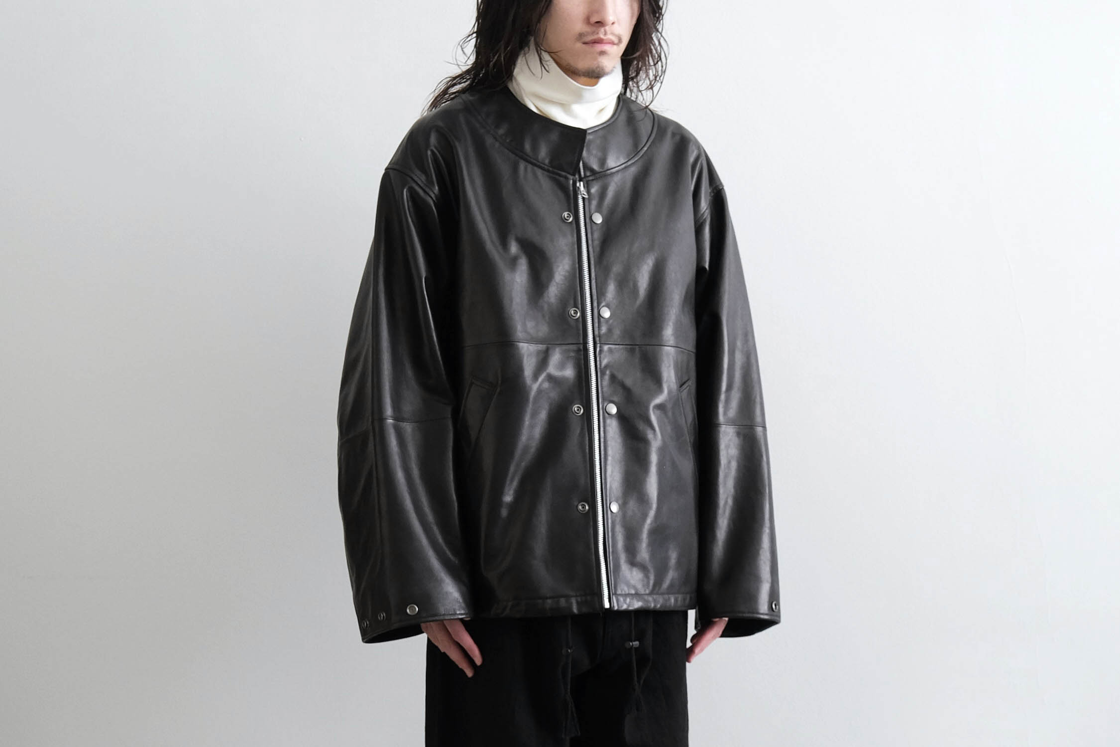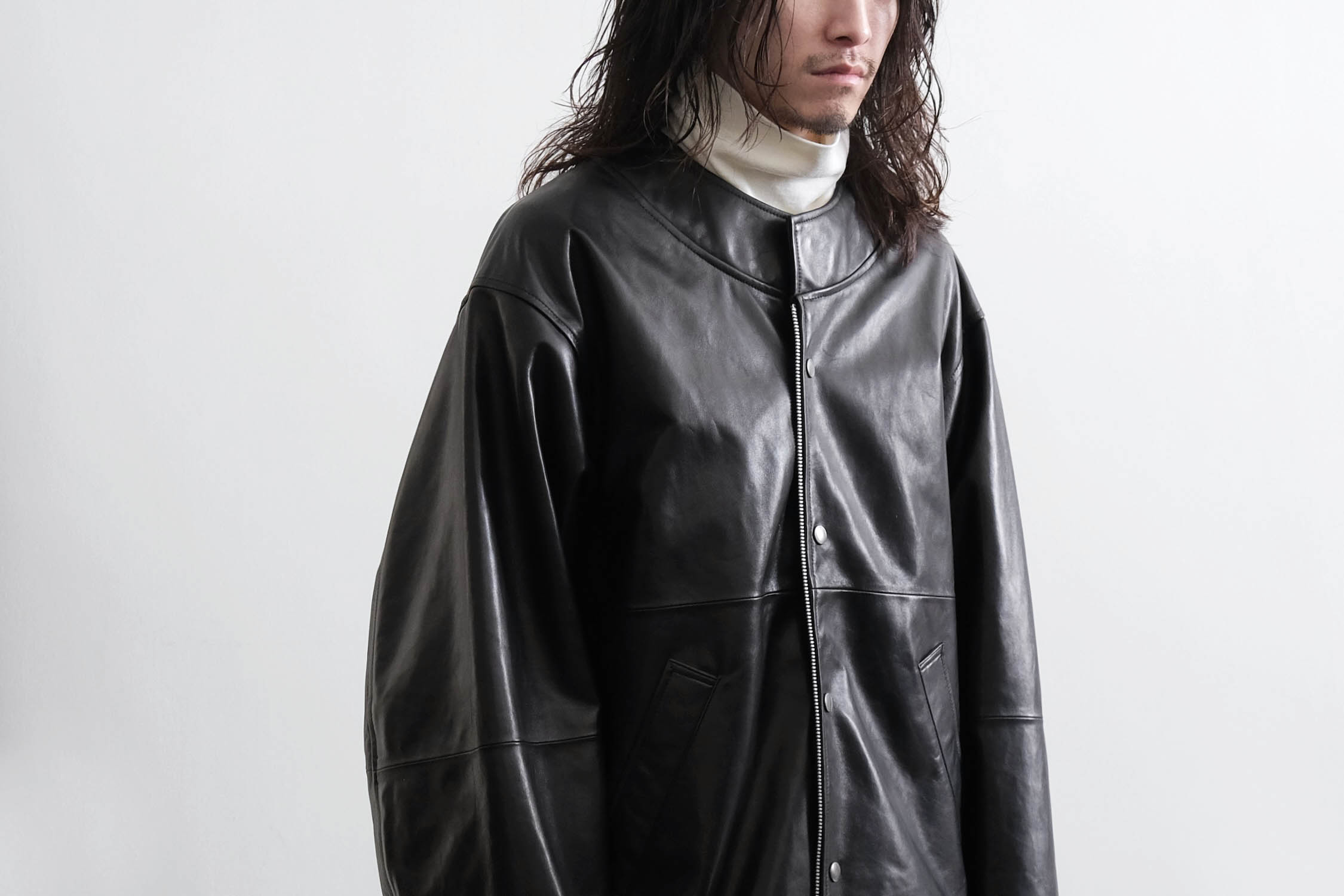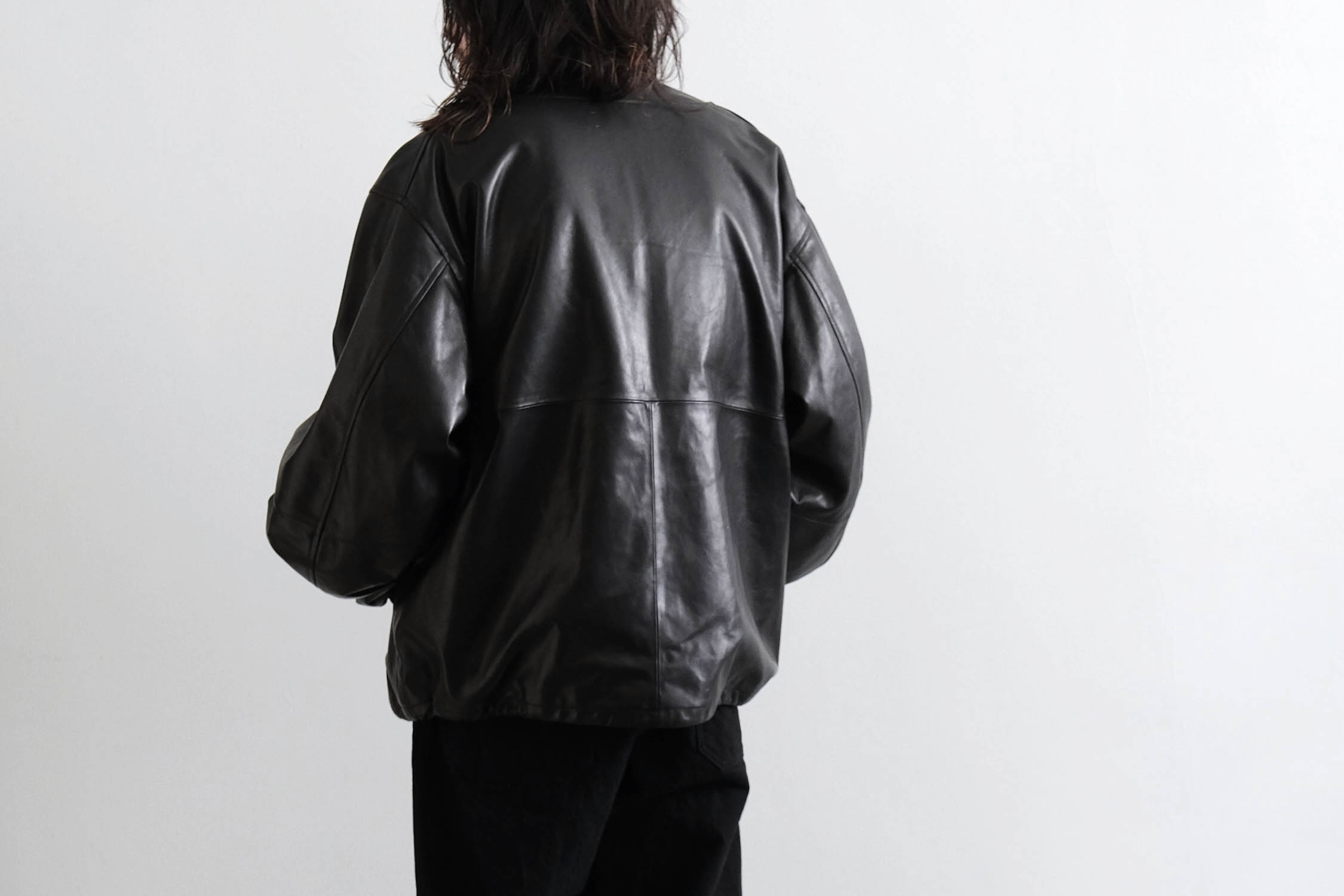 オーバーサイズのレザースタンドカラーブルゾン。