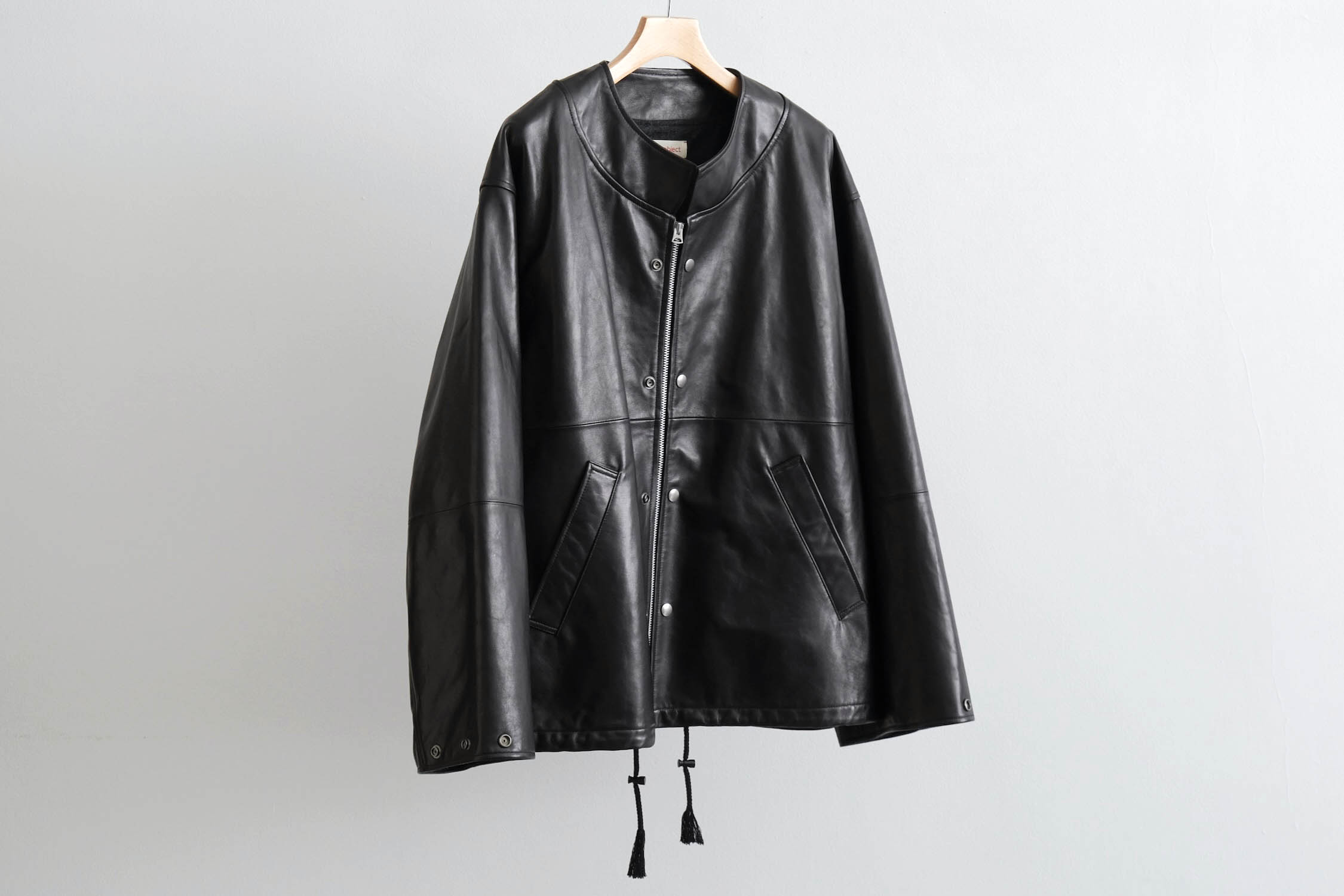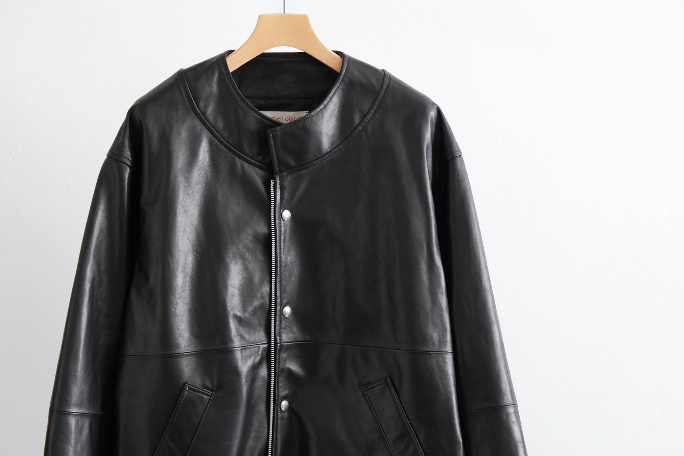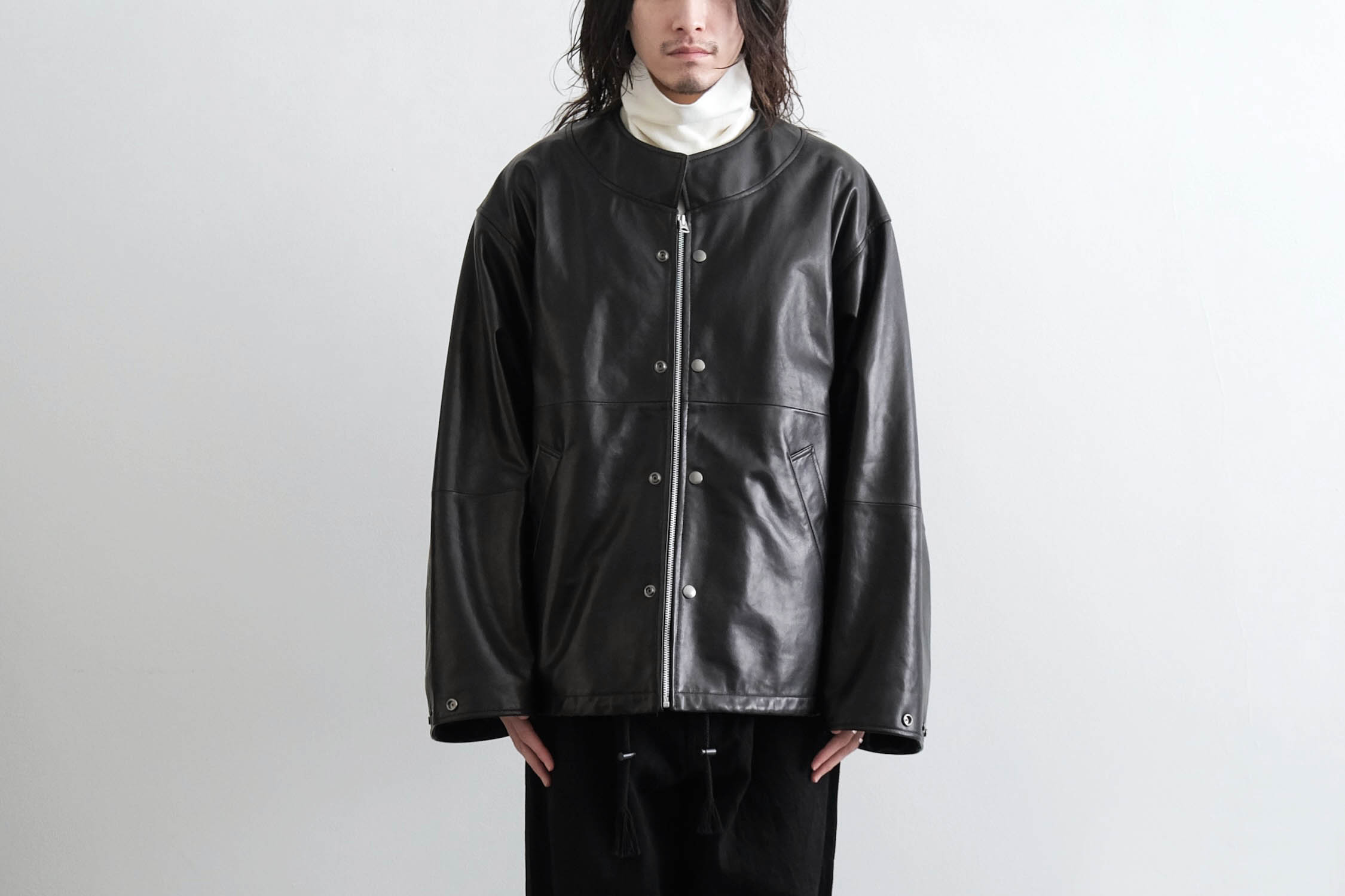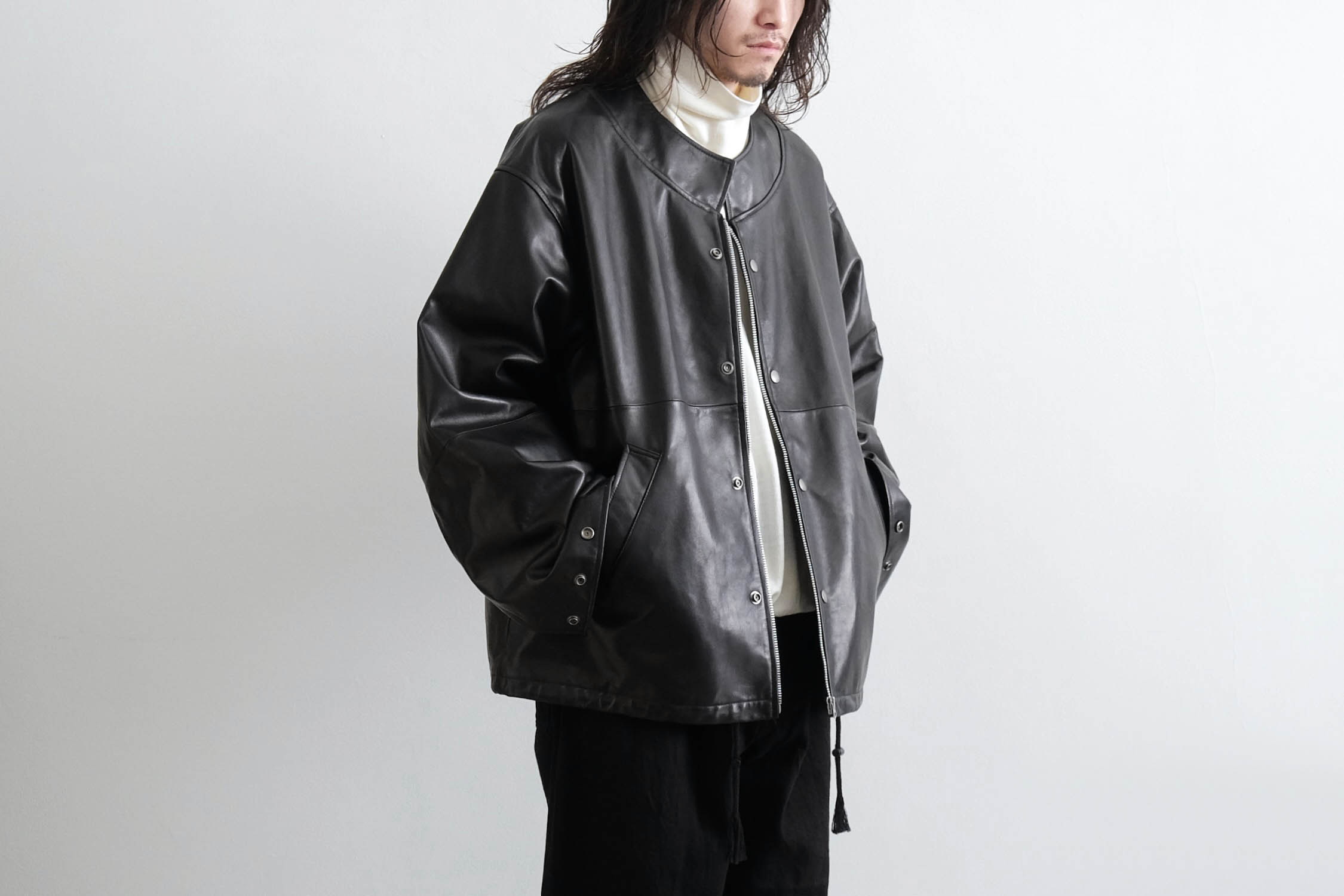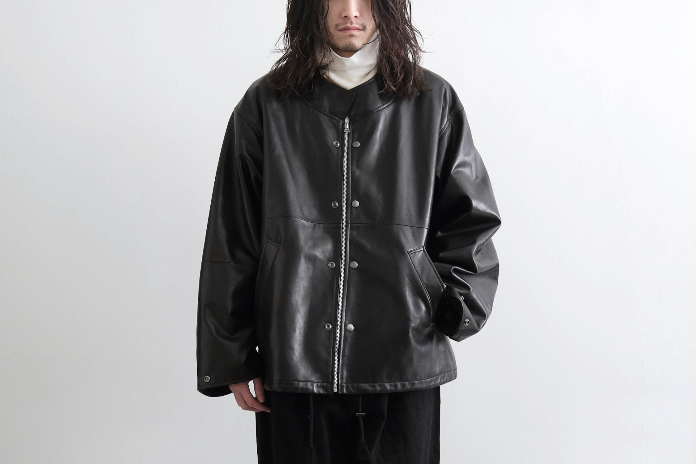 オーバーサイズのレザースタンドカラーブルゾン。