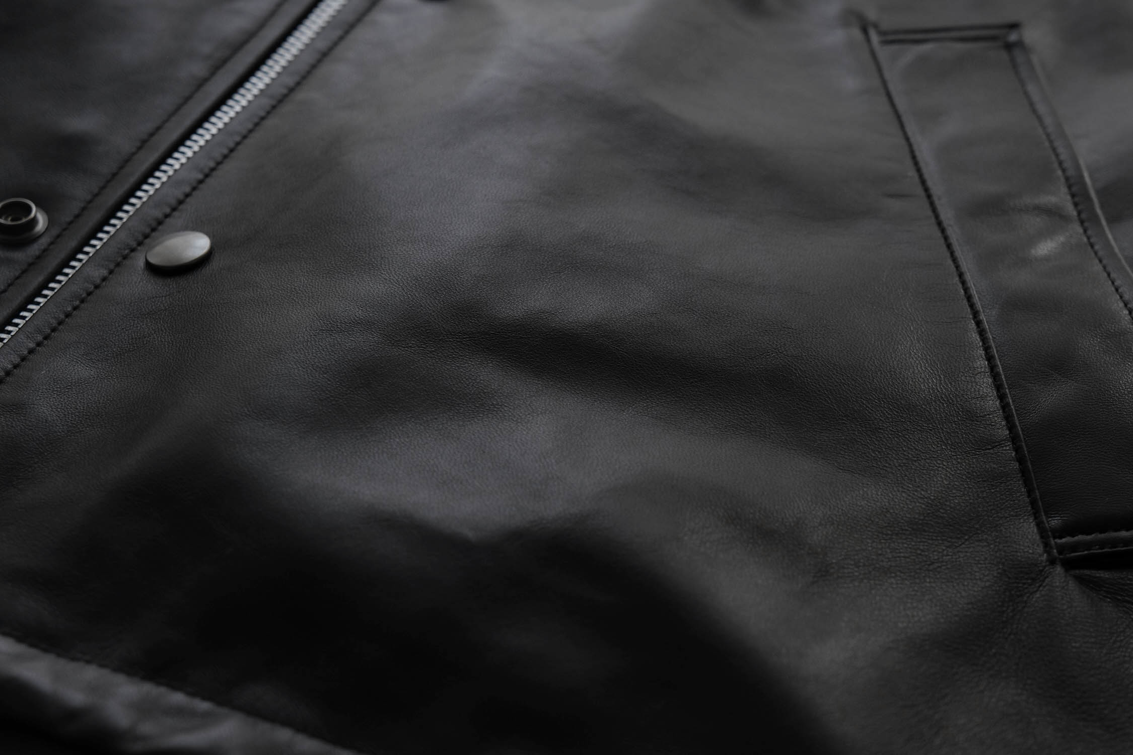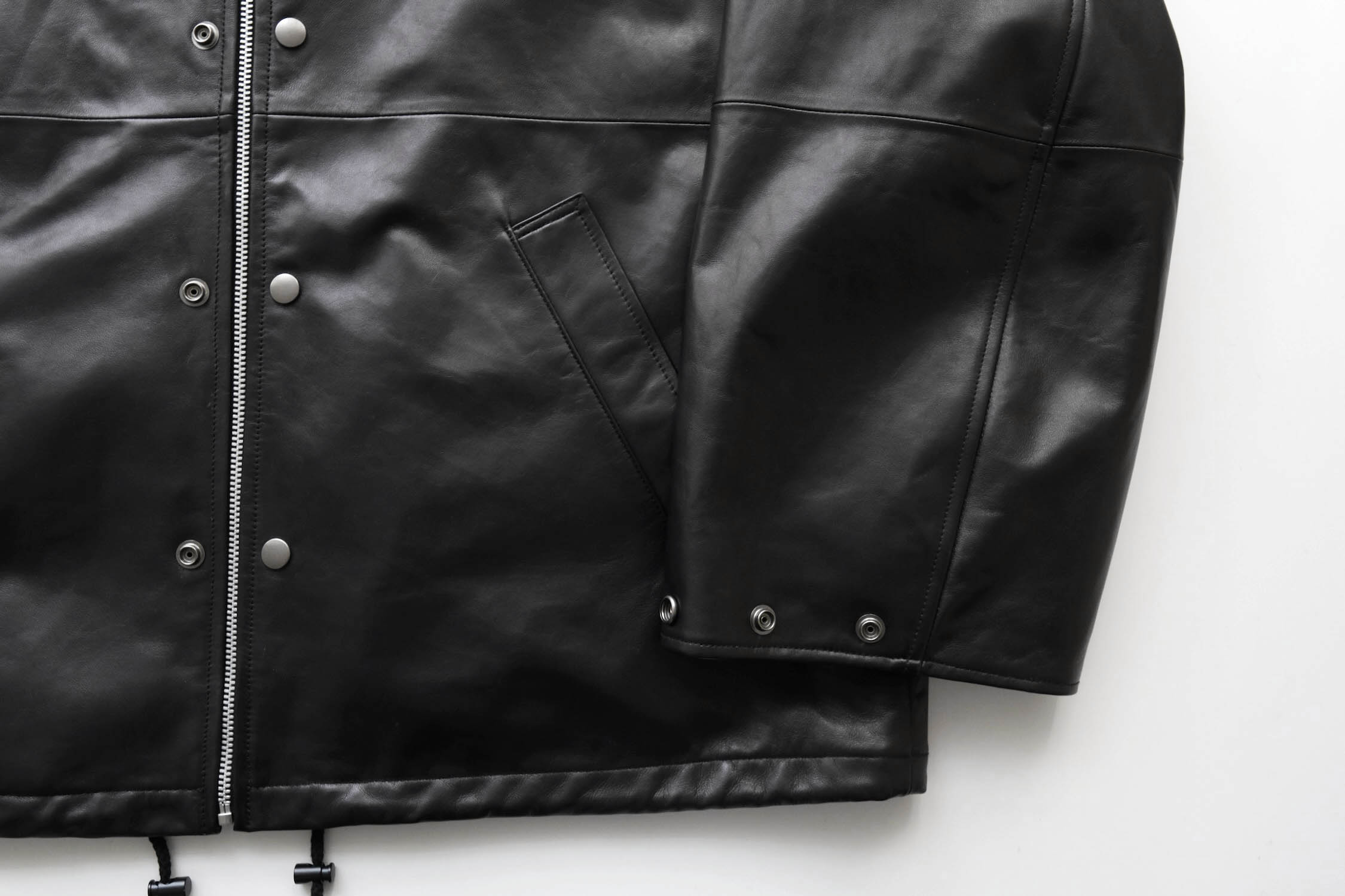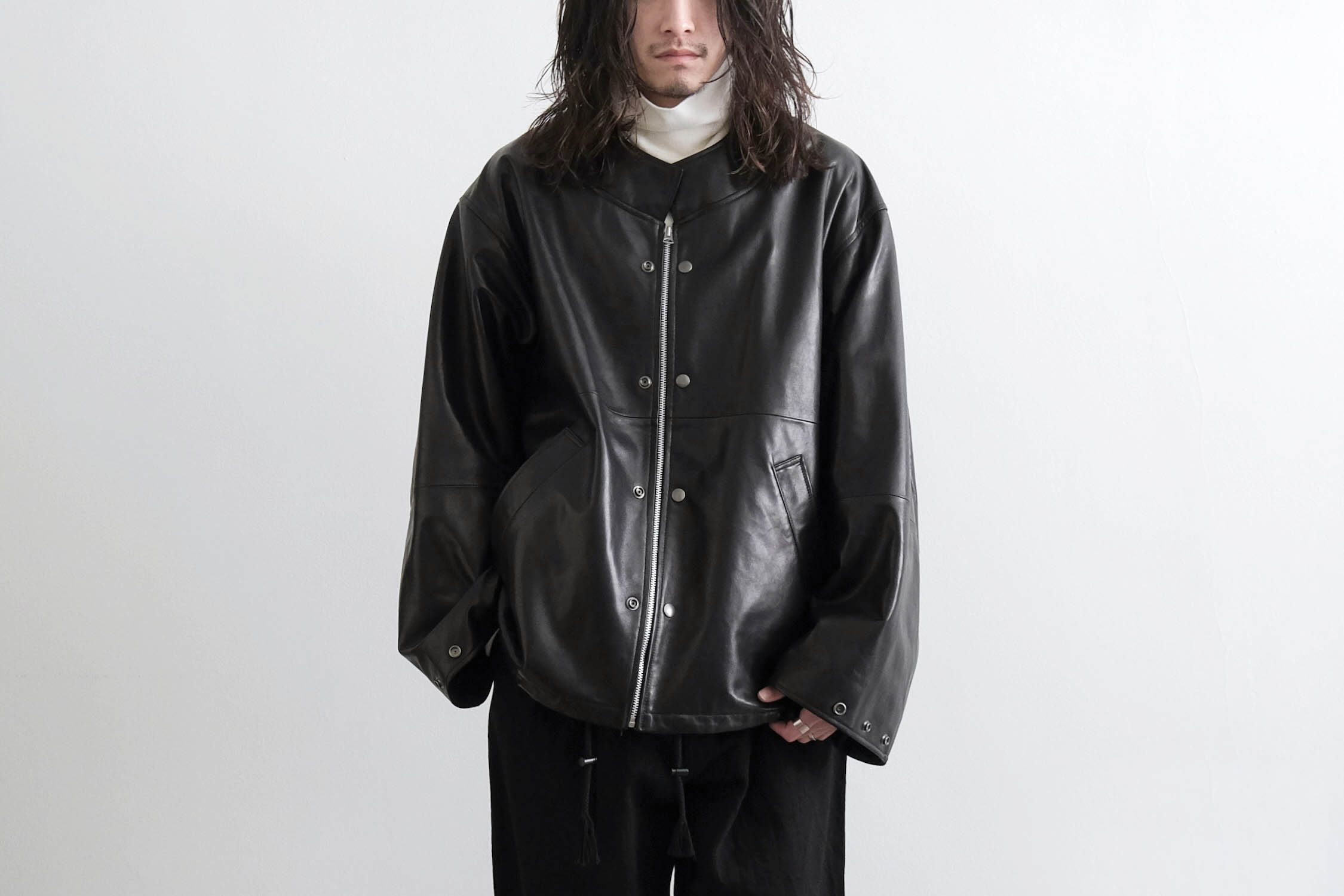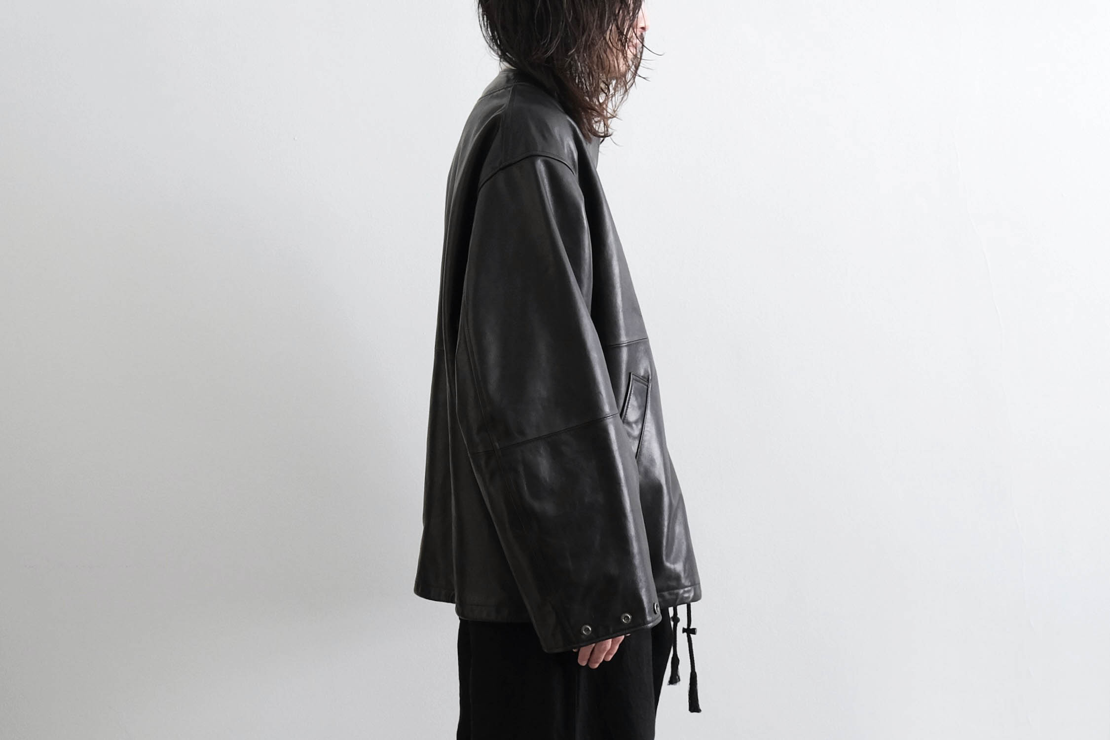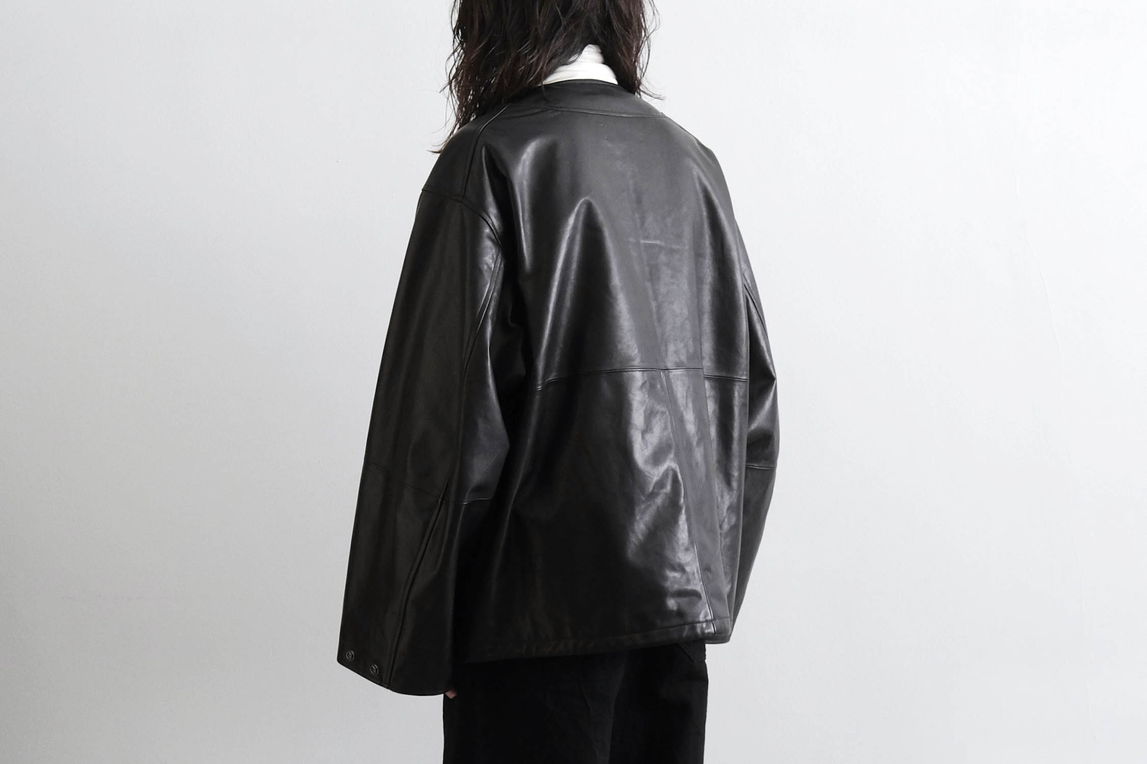 レザーアイテムらしい無骨さと、洗練されたモード感も感じる一着。