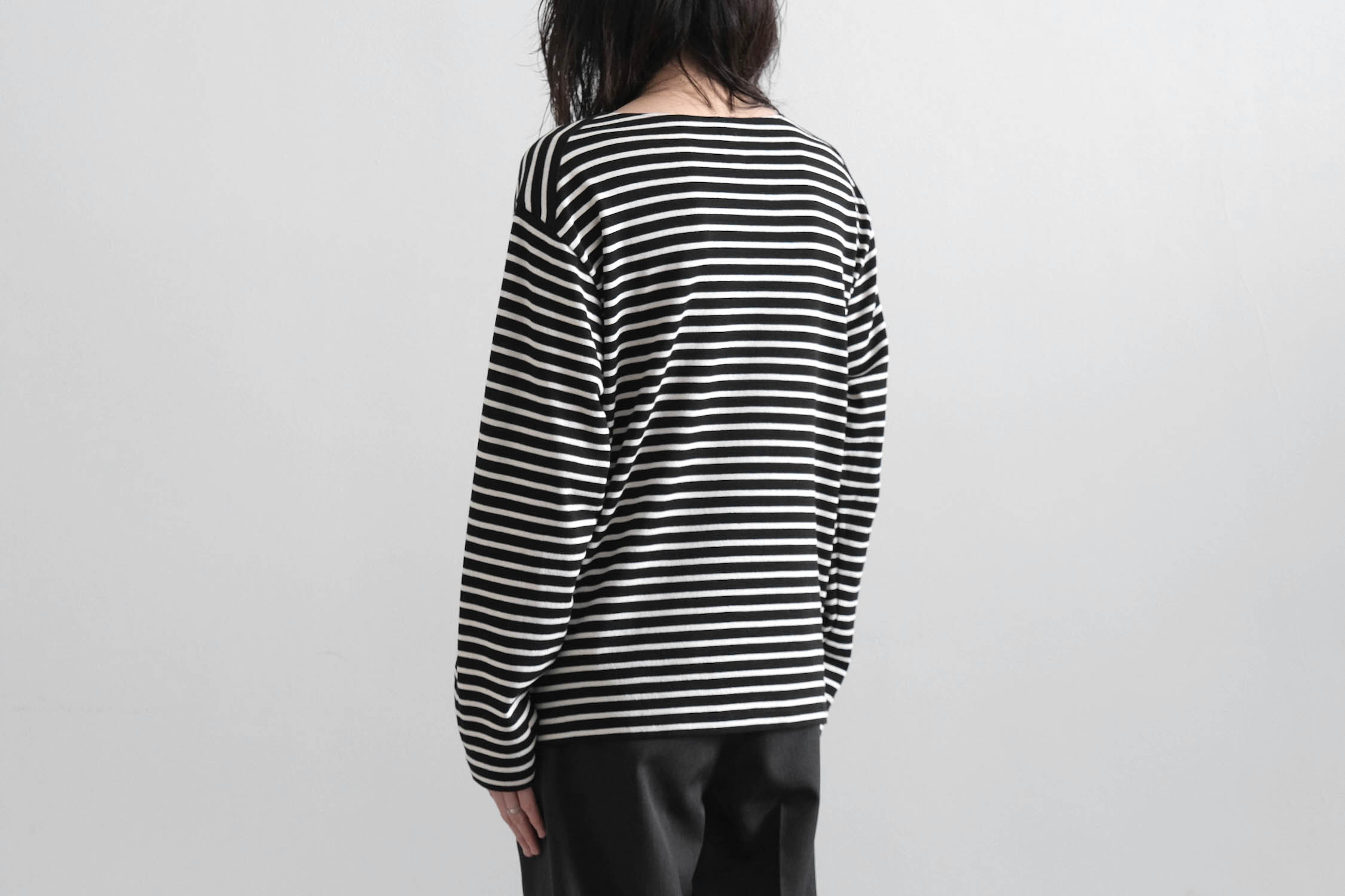 素材のドレープ性を活かすたっぷりとした分量で、バスクシャツながら優雅な印象です。