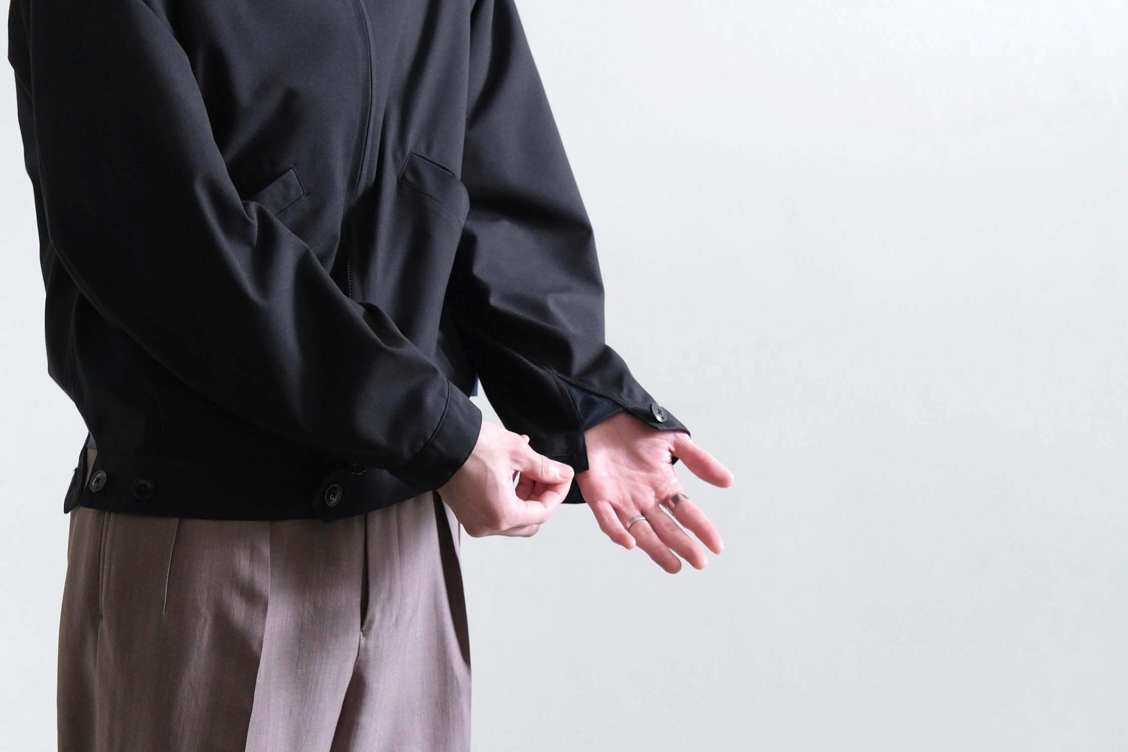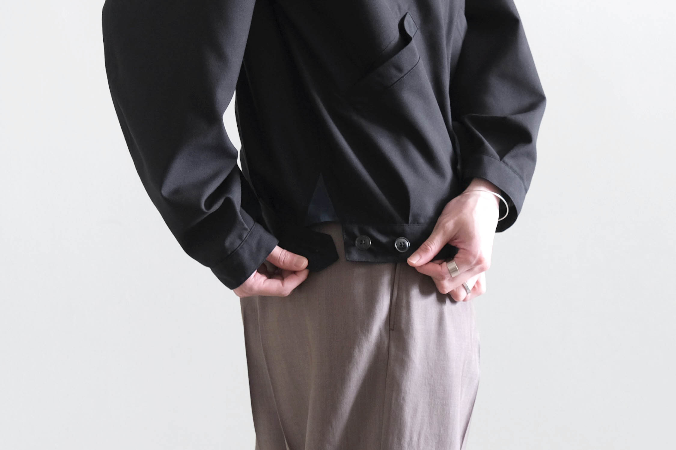 ボタンやポケットなどの付属を排除したフロントや比翼仕様の袖口ボタンなどミニマルなデザイン。