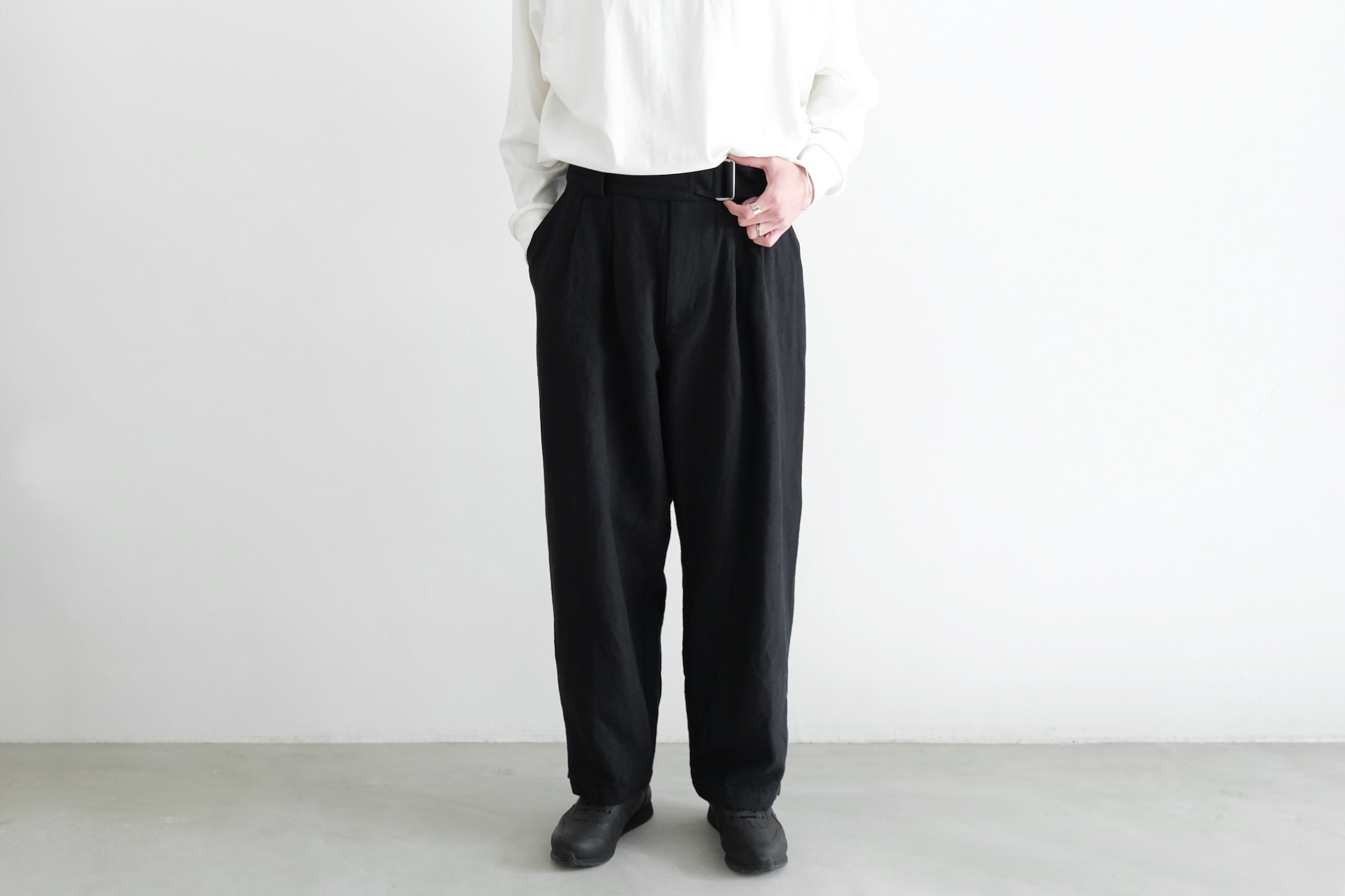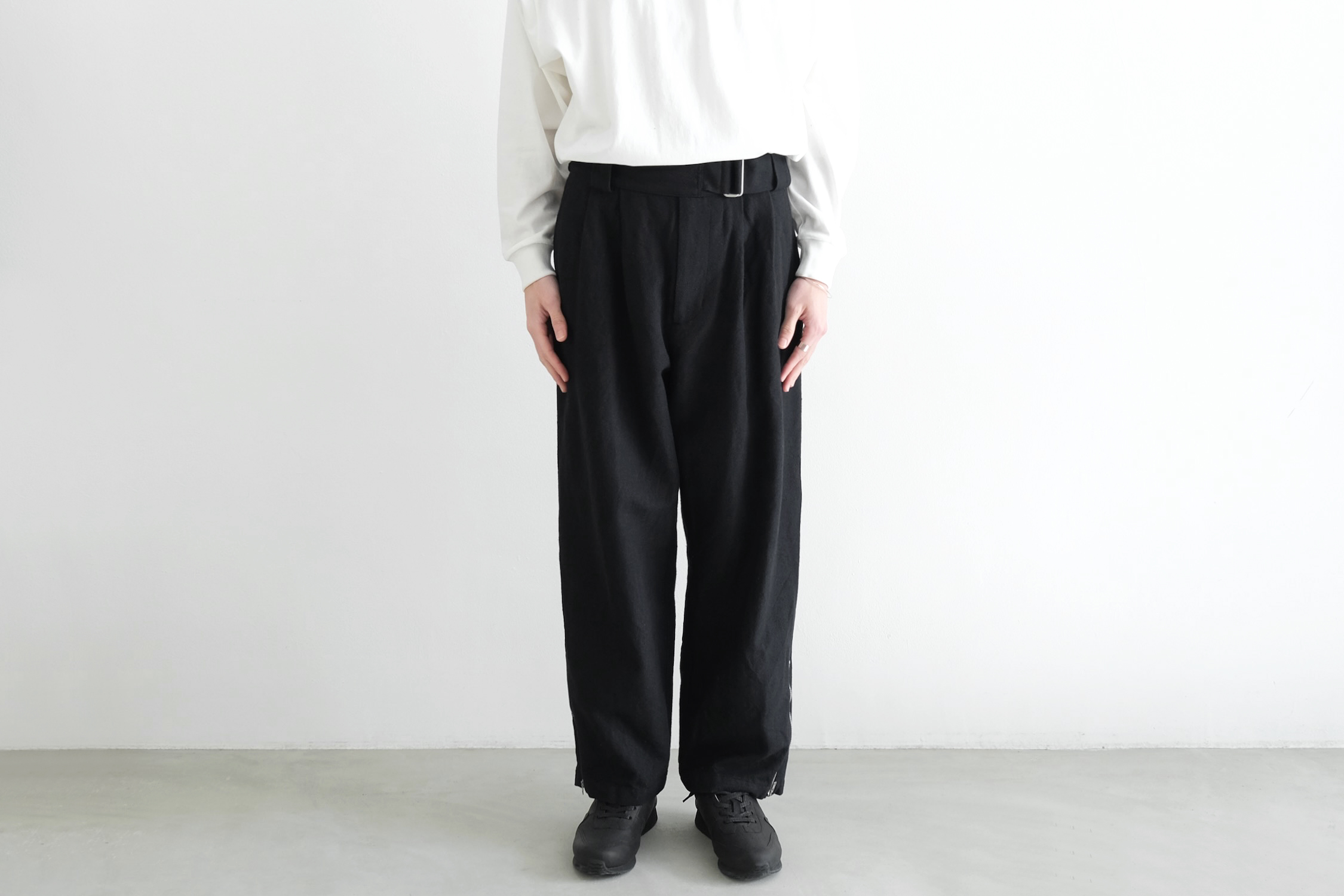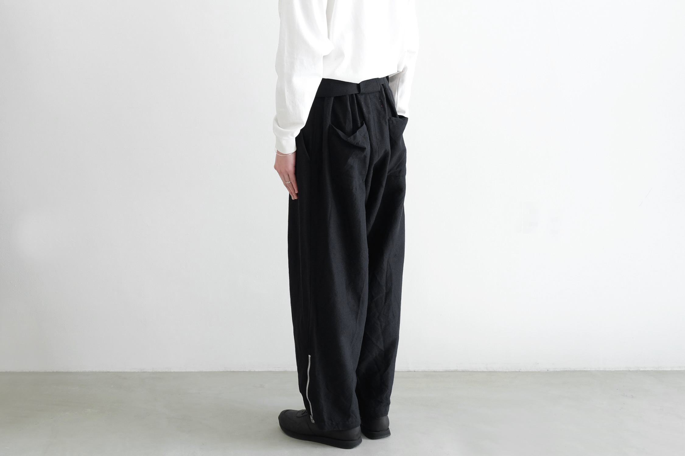 生地分量をたっぷり取った2タックの腰回りから緩やかにテーパードを掛けた迫力のワイドシルエット。