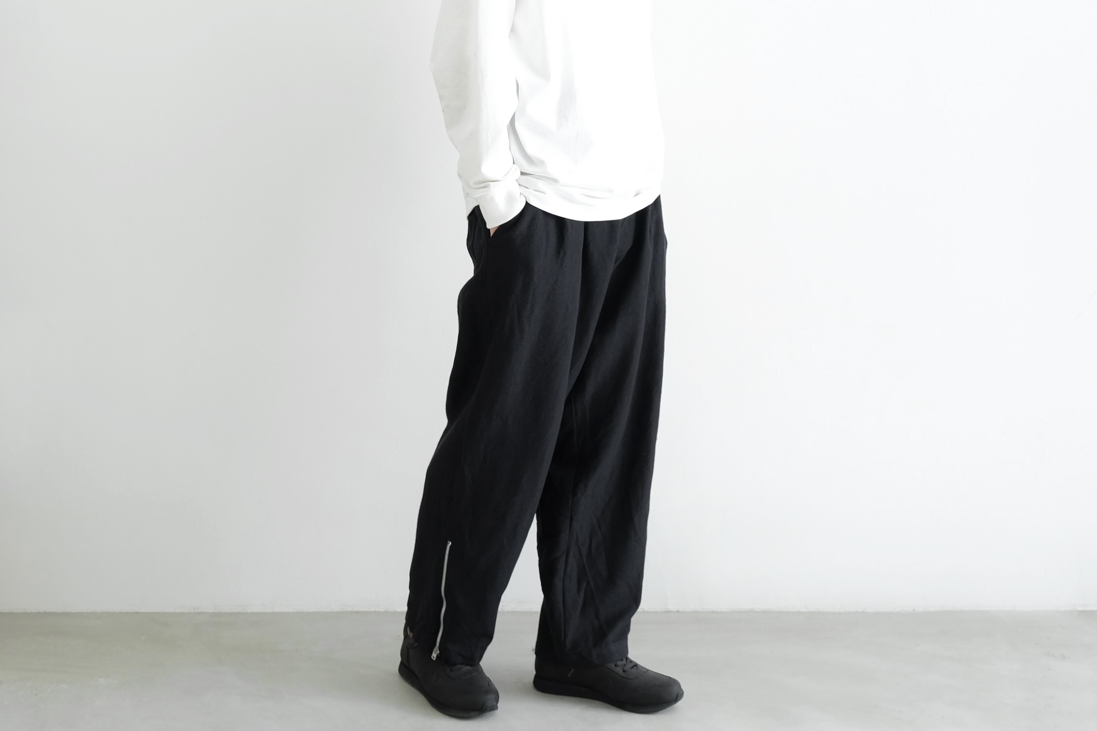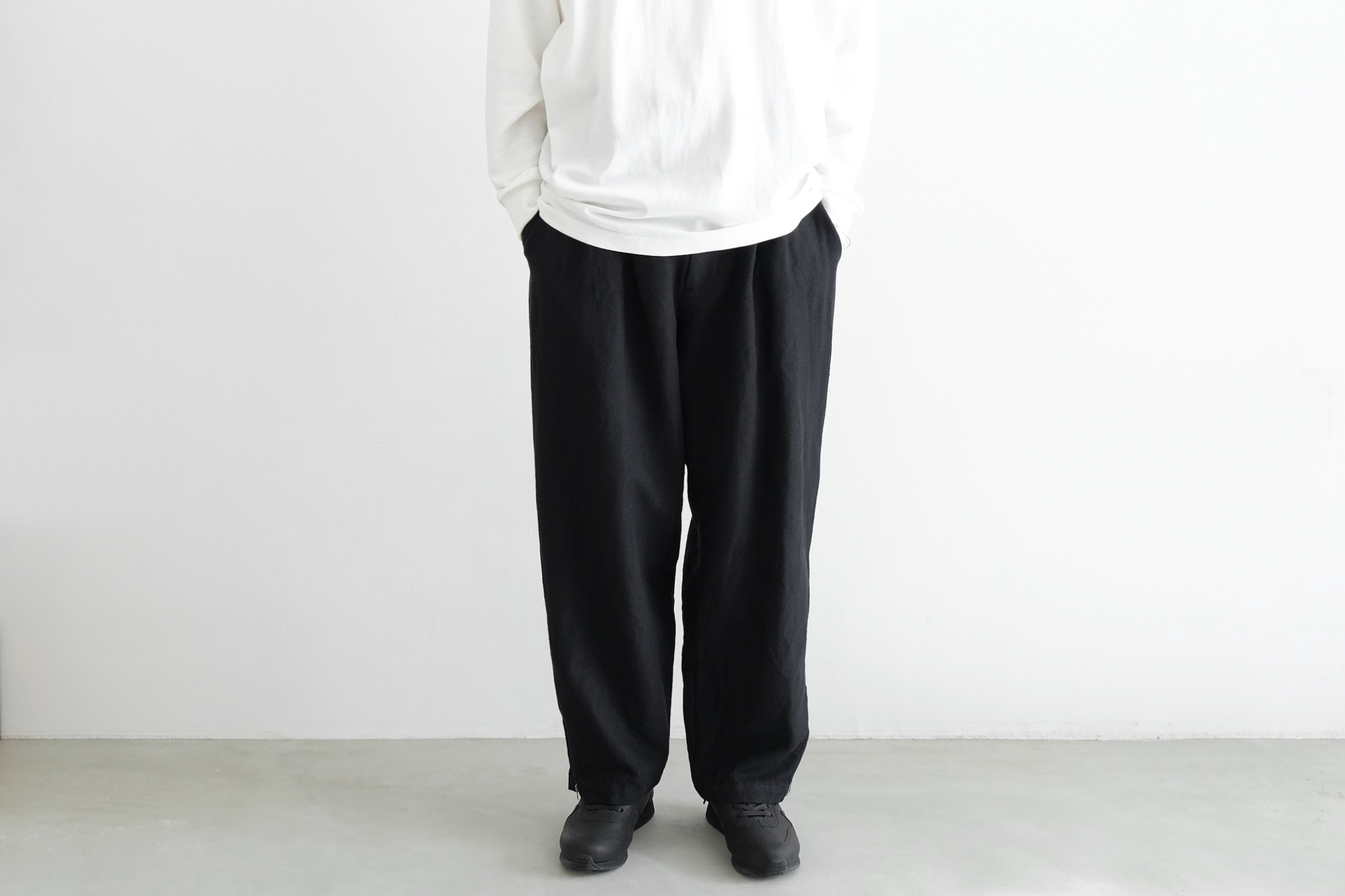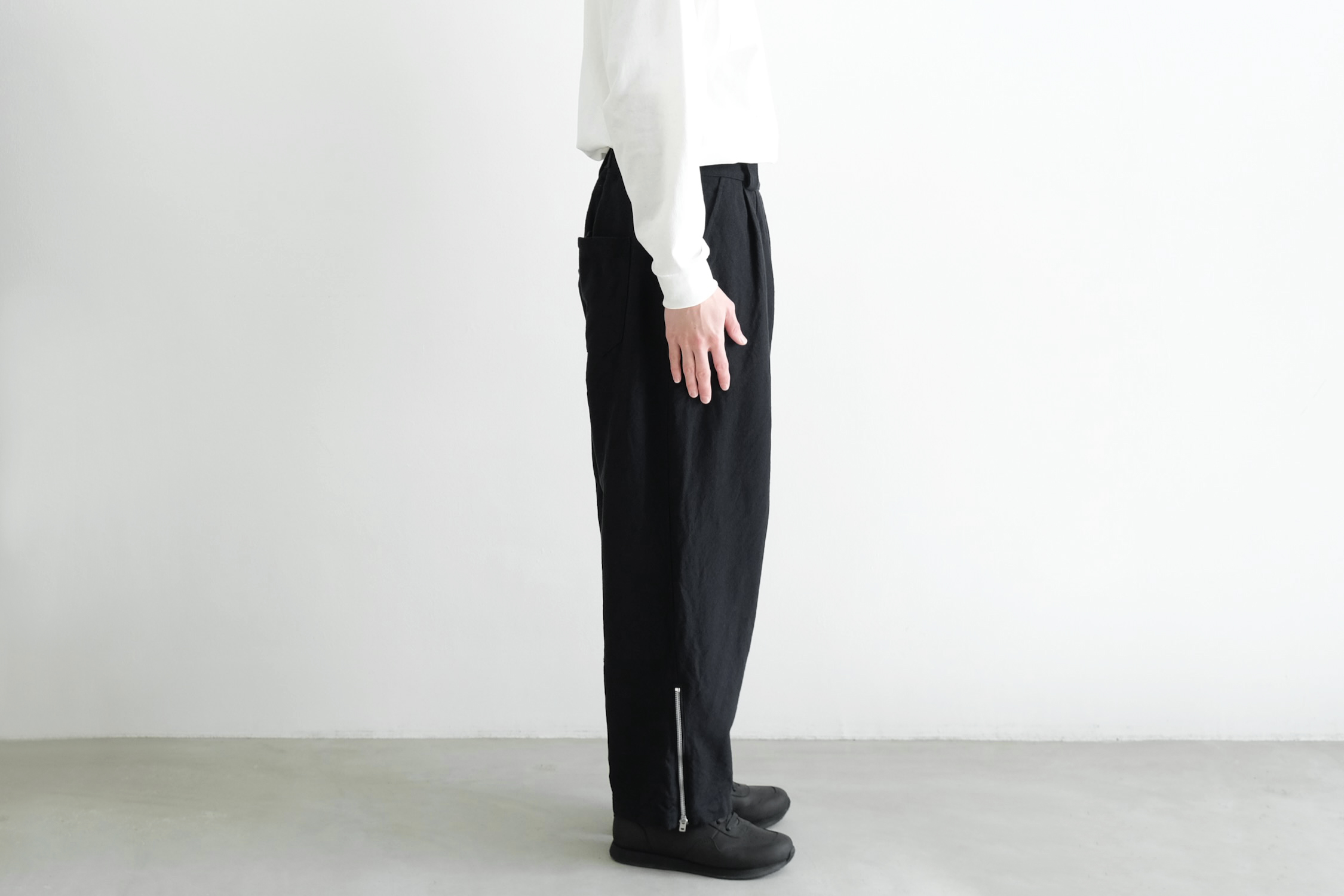 生地分量をたっぷり取った2タックの腰回りから緩やかにテーパードを掛けた迫力のワイドシルエット。
