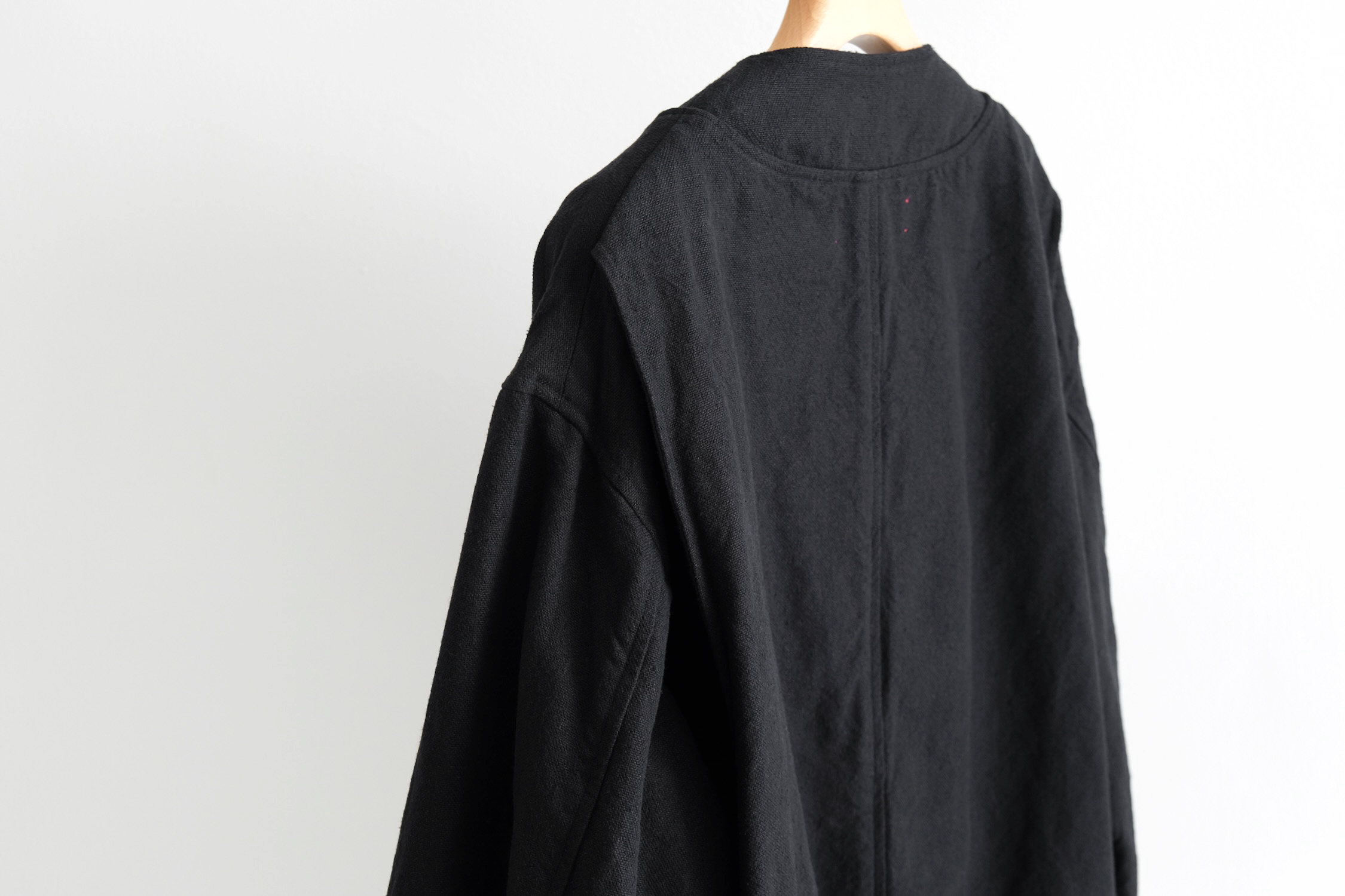 広めのスタンドカラーは首周りをスッキリと。