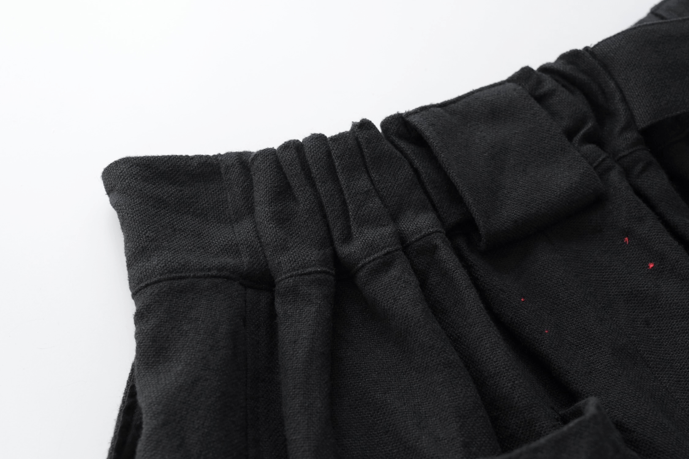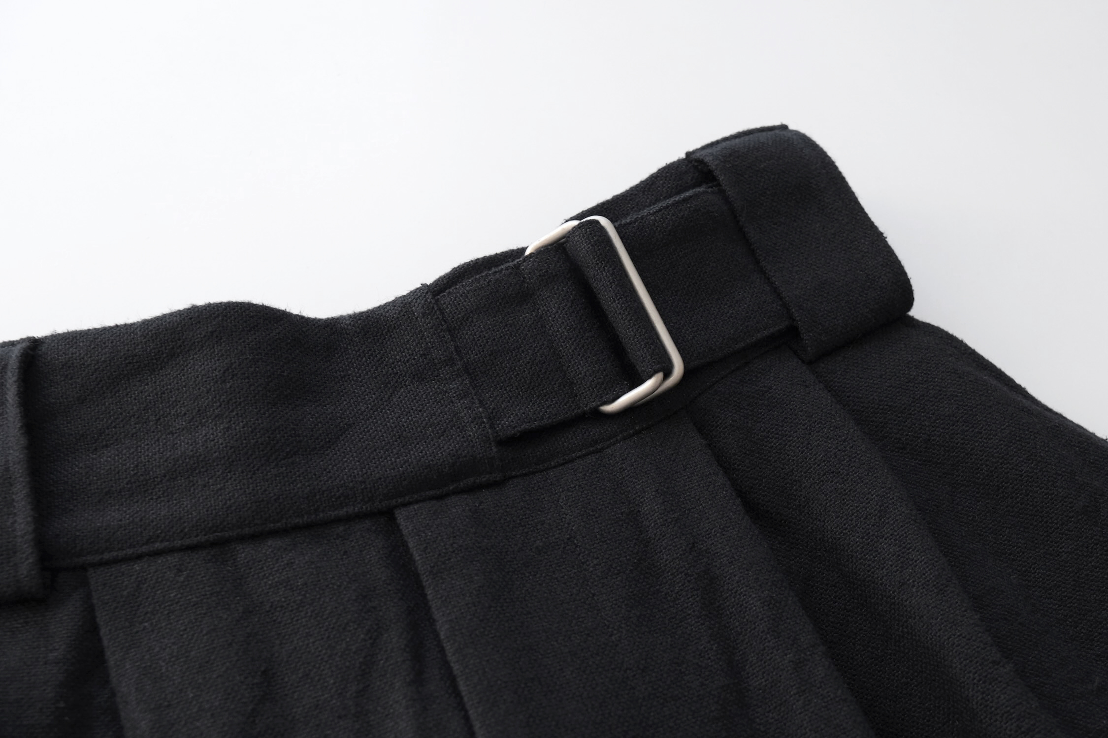 一般的な紳士服とは逆方向のベルト付けやアシンメトリーのベルトループ。
