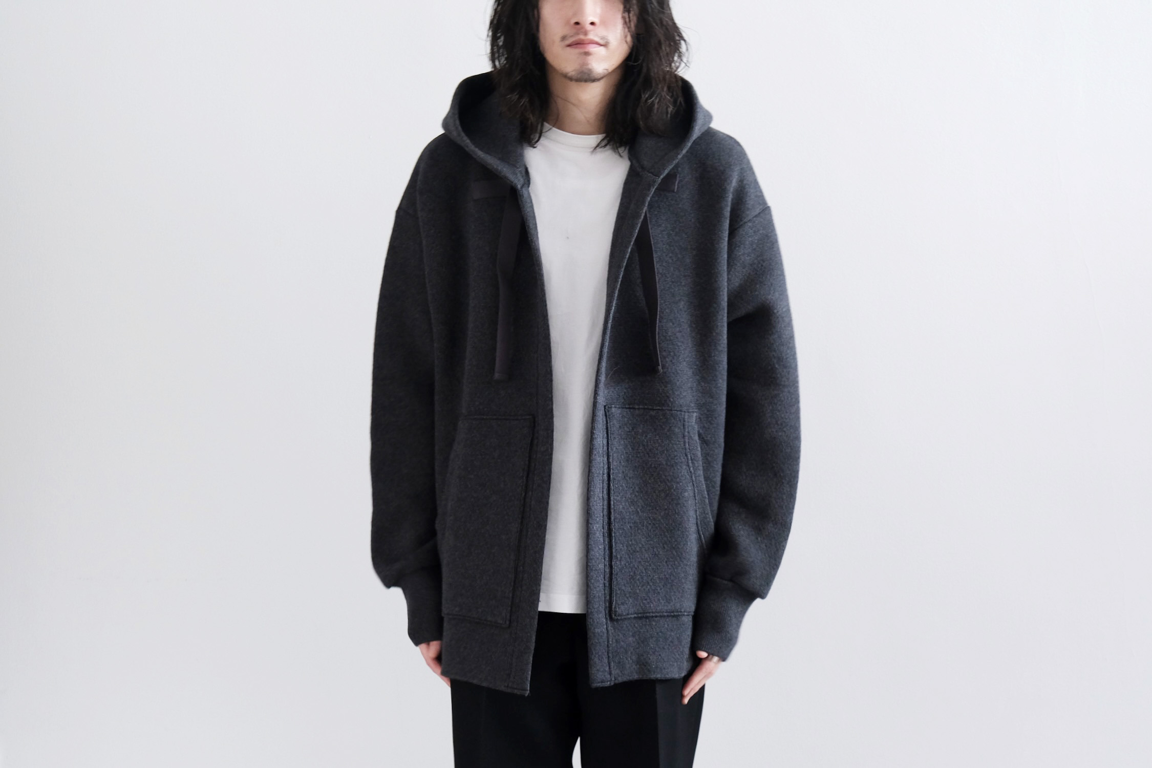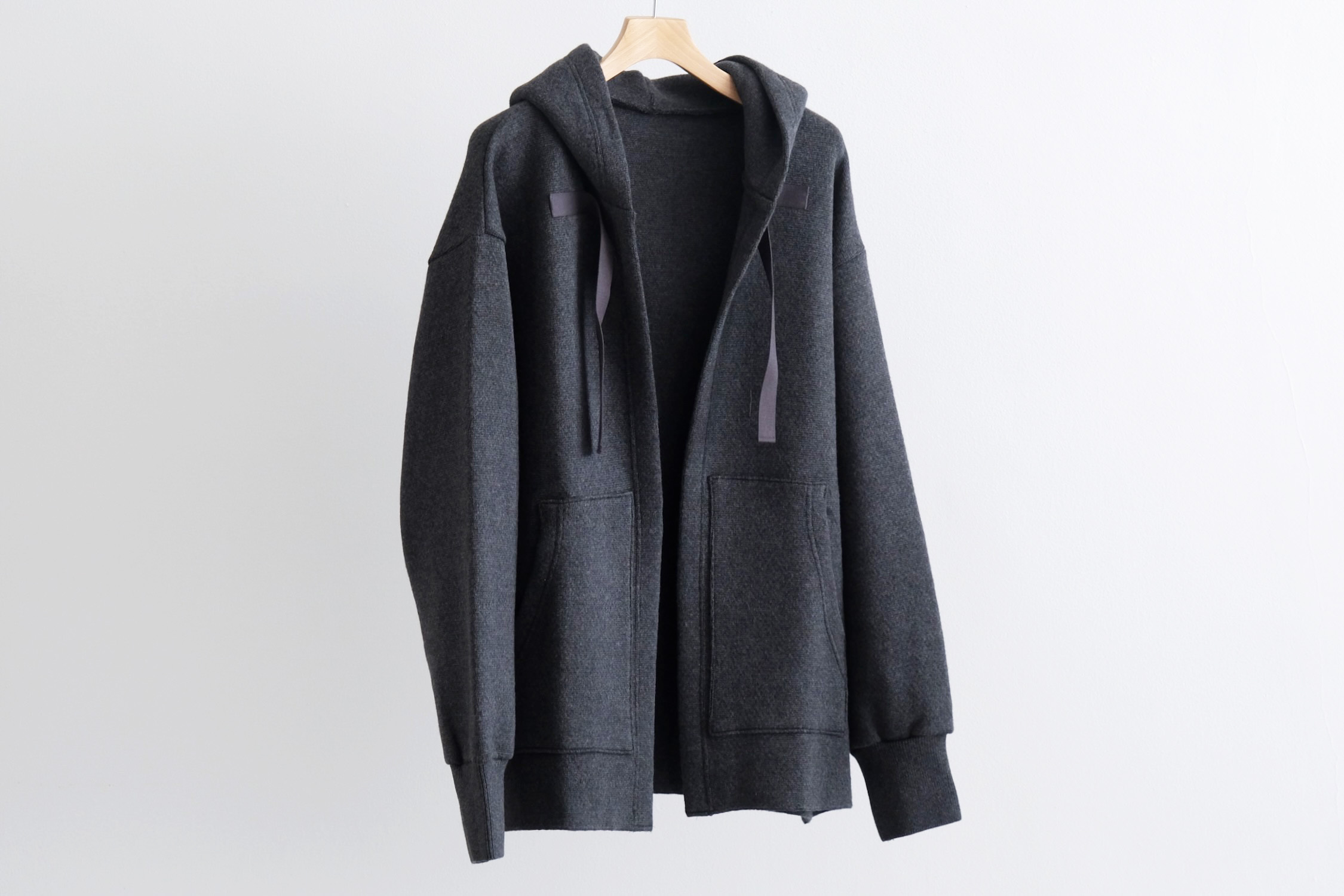 ボタンレスのフロントや、内側に配したポケットなどすっきりとしたデザインでシャープな印象に。