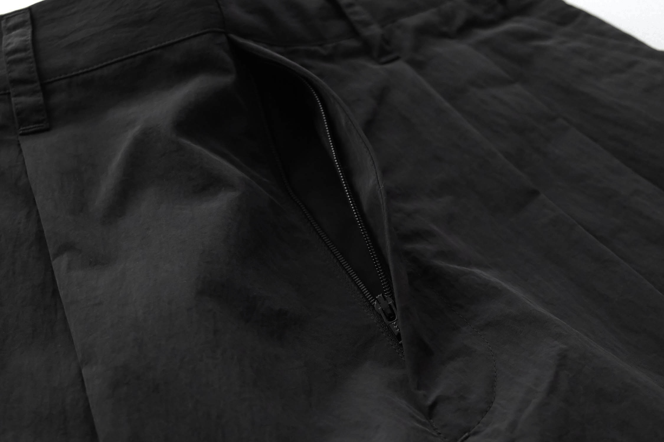 比翼仕様でステッチレスのガンパッチやラペルのコバから現れるホックなど装飾を排除したフロント。