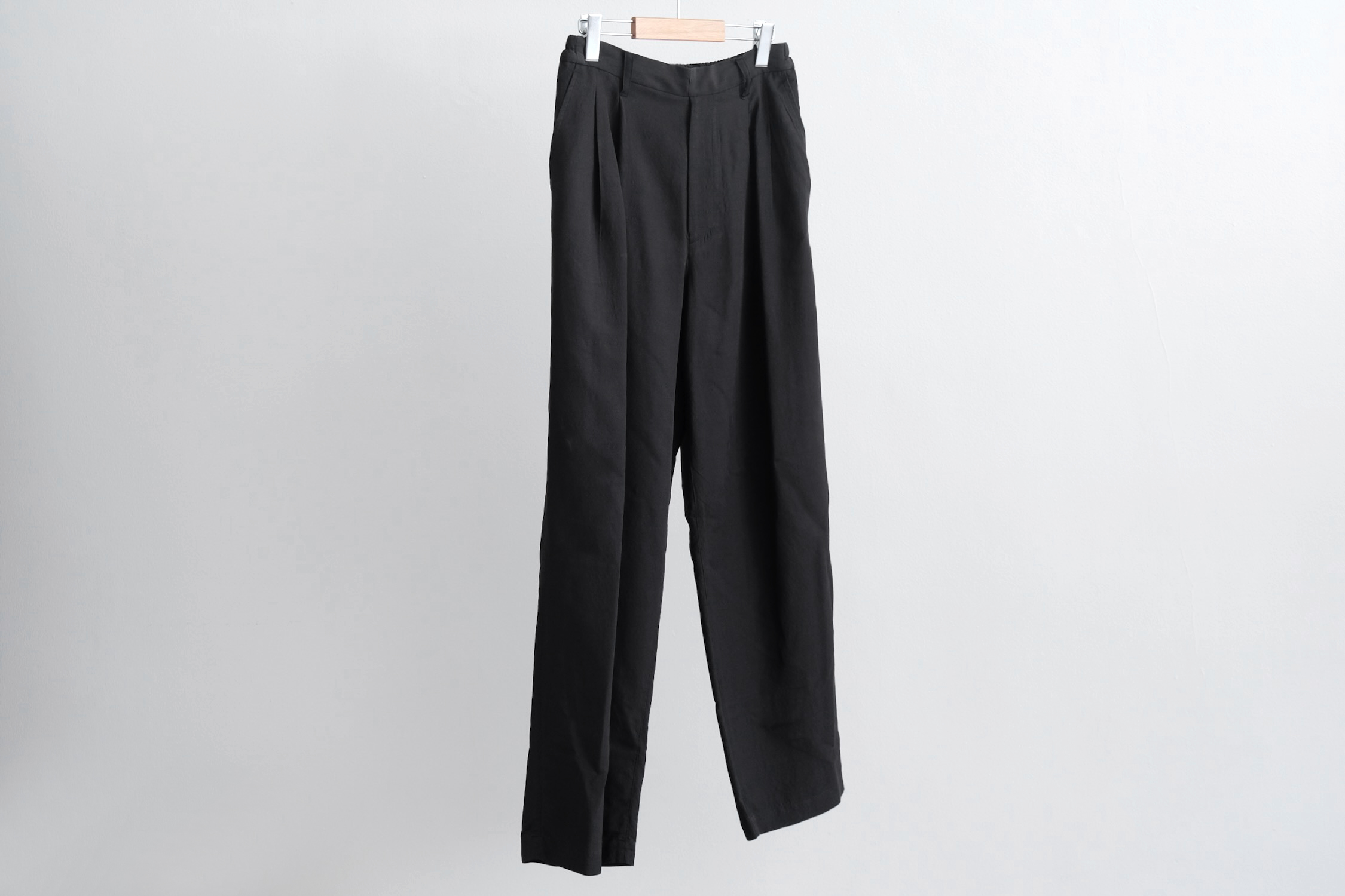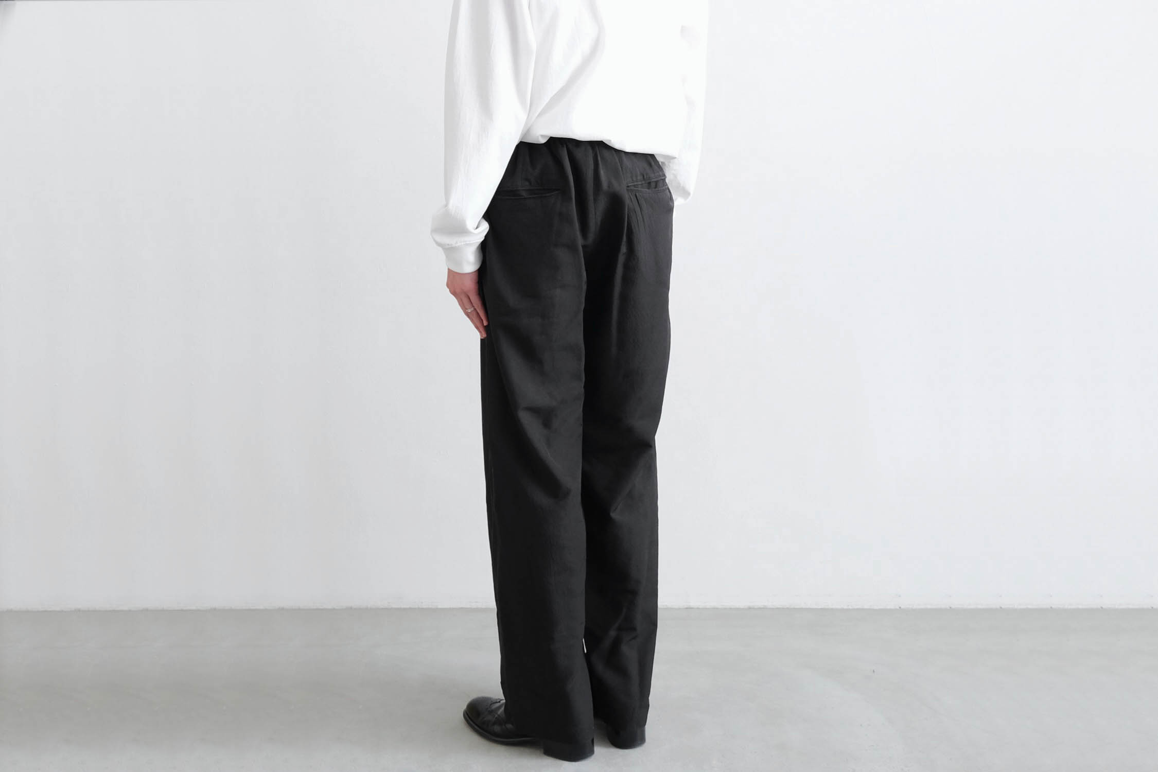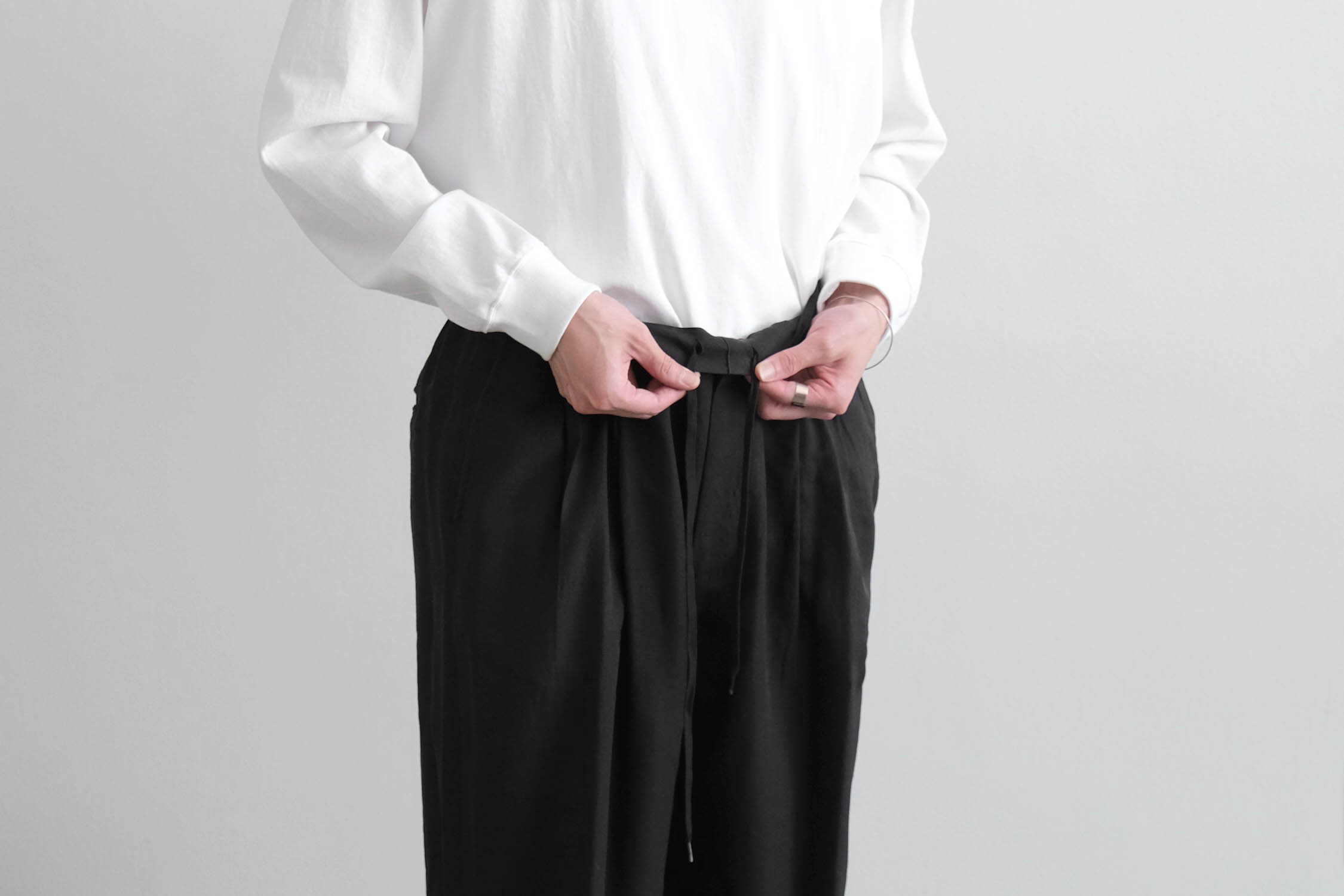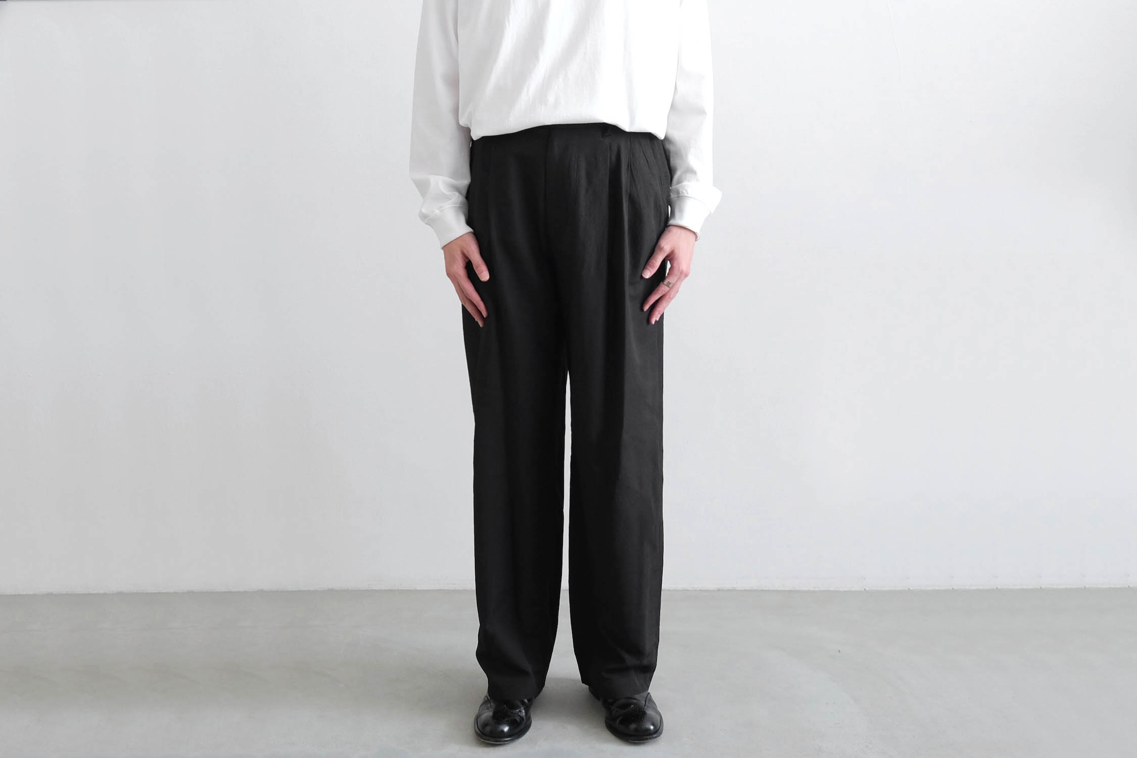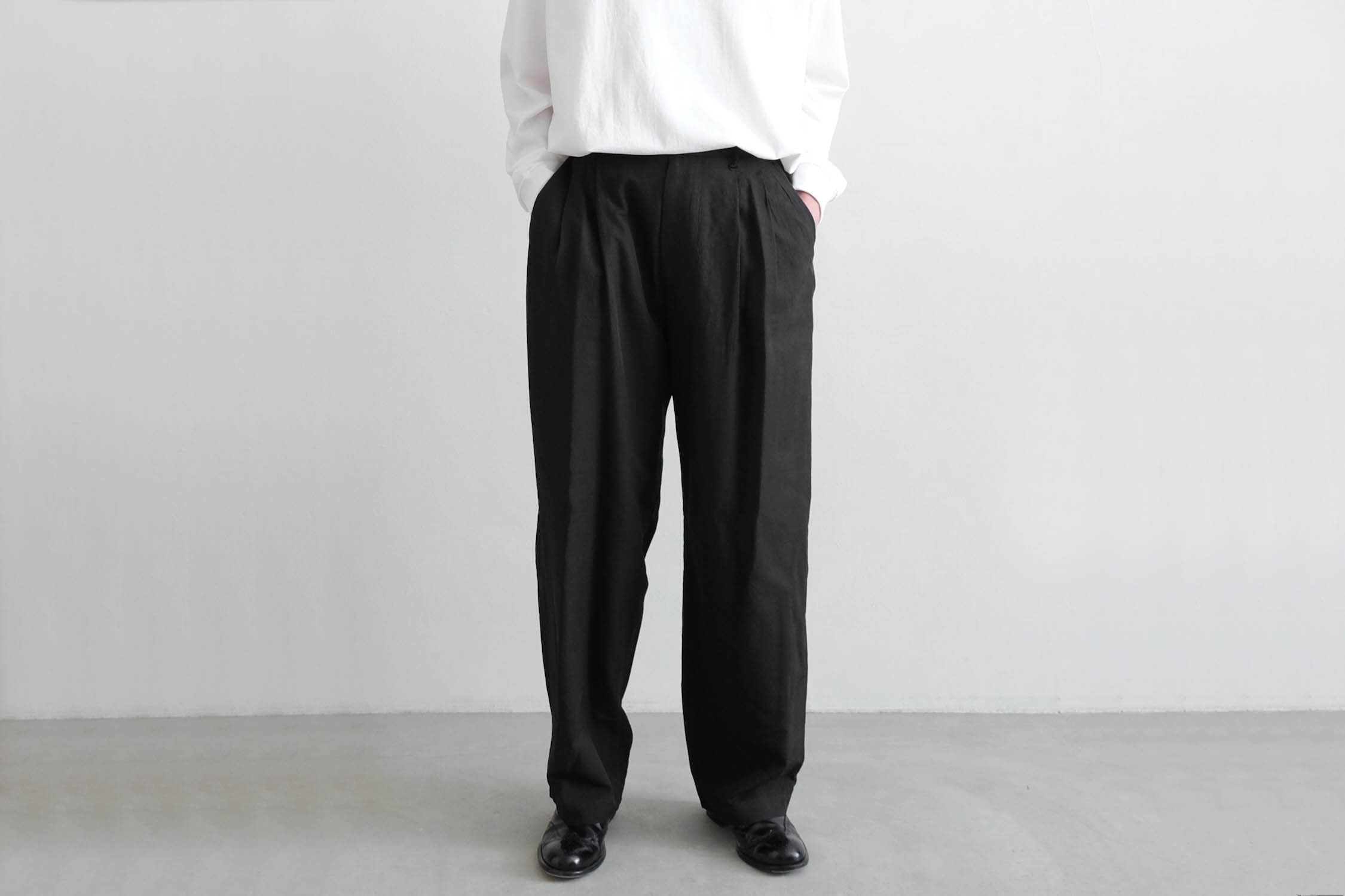 ツータックのゆとりある腰回りから裾にかけて緩やかにテーパードしたワイドテーパードシルエット。