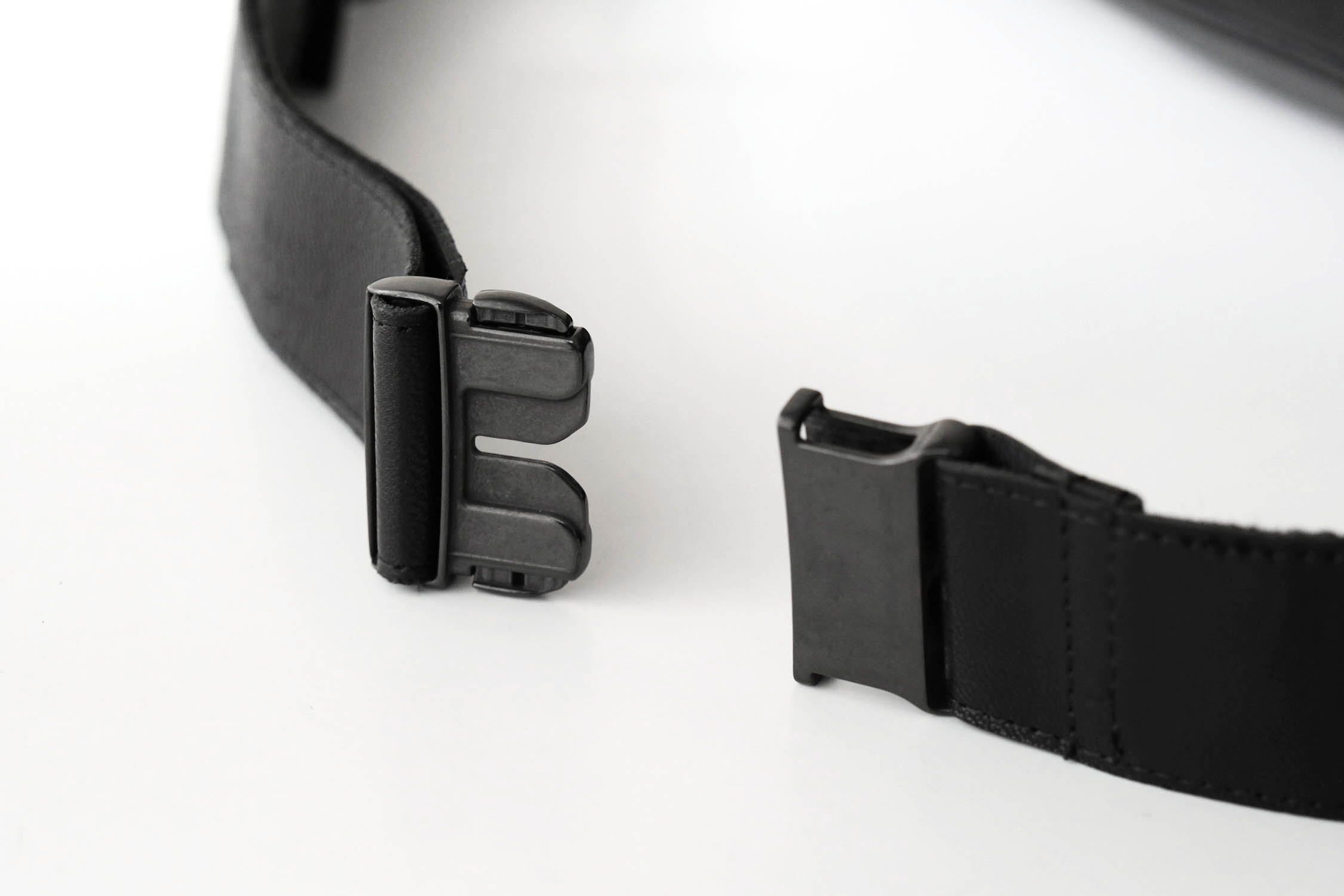 ボディと同素材のベルトや重厚な佇まいの本体同色のアジャスターバックル。