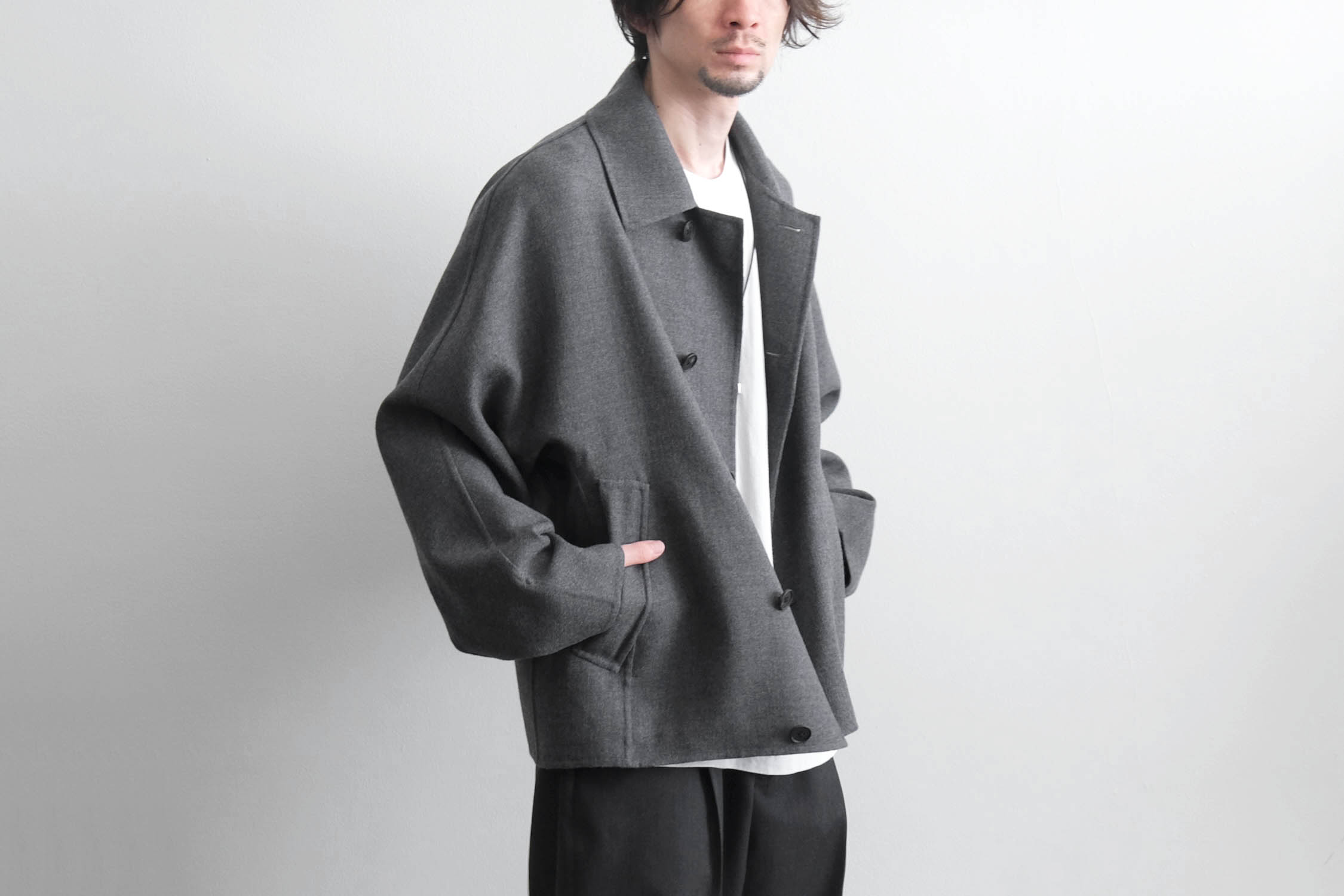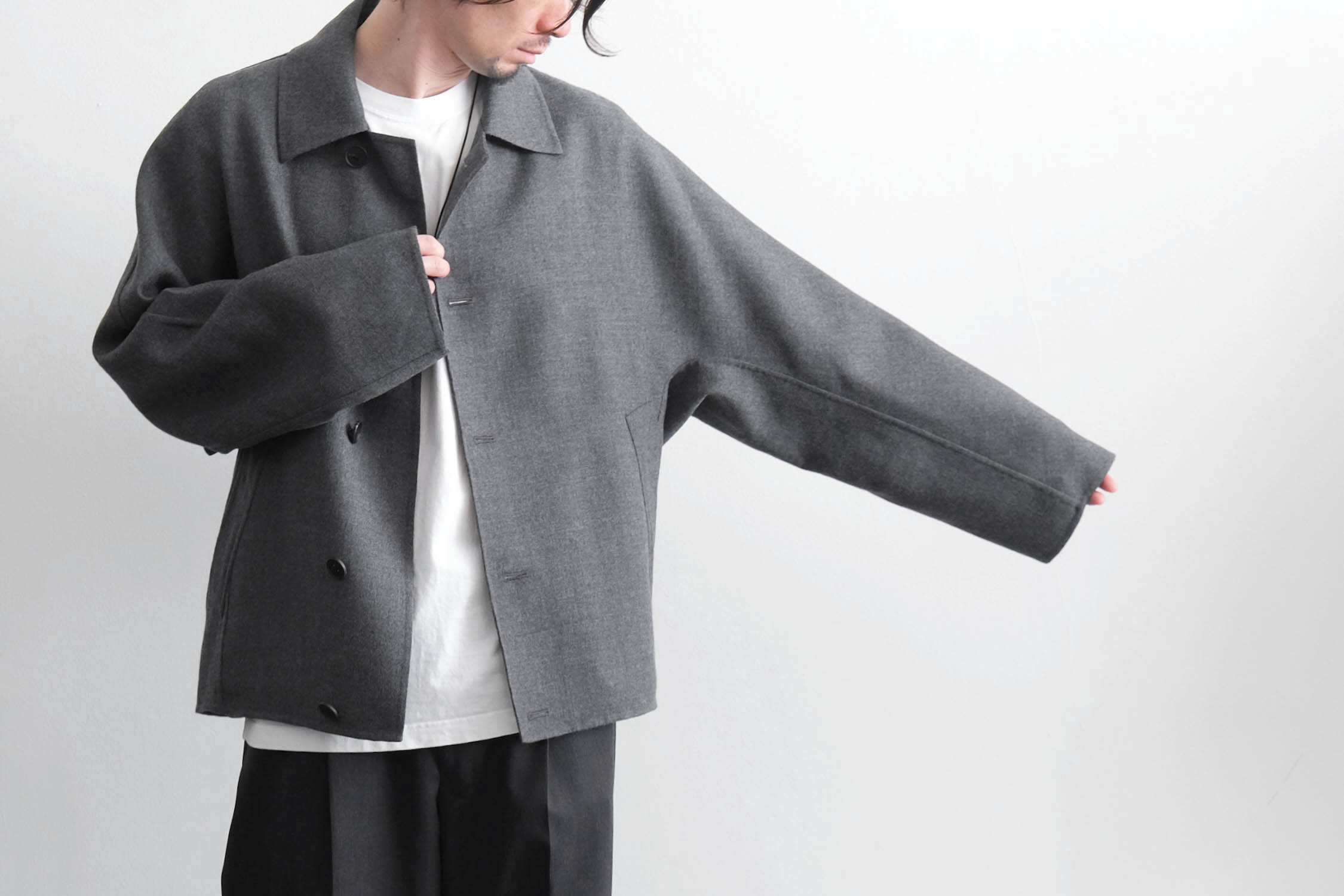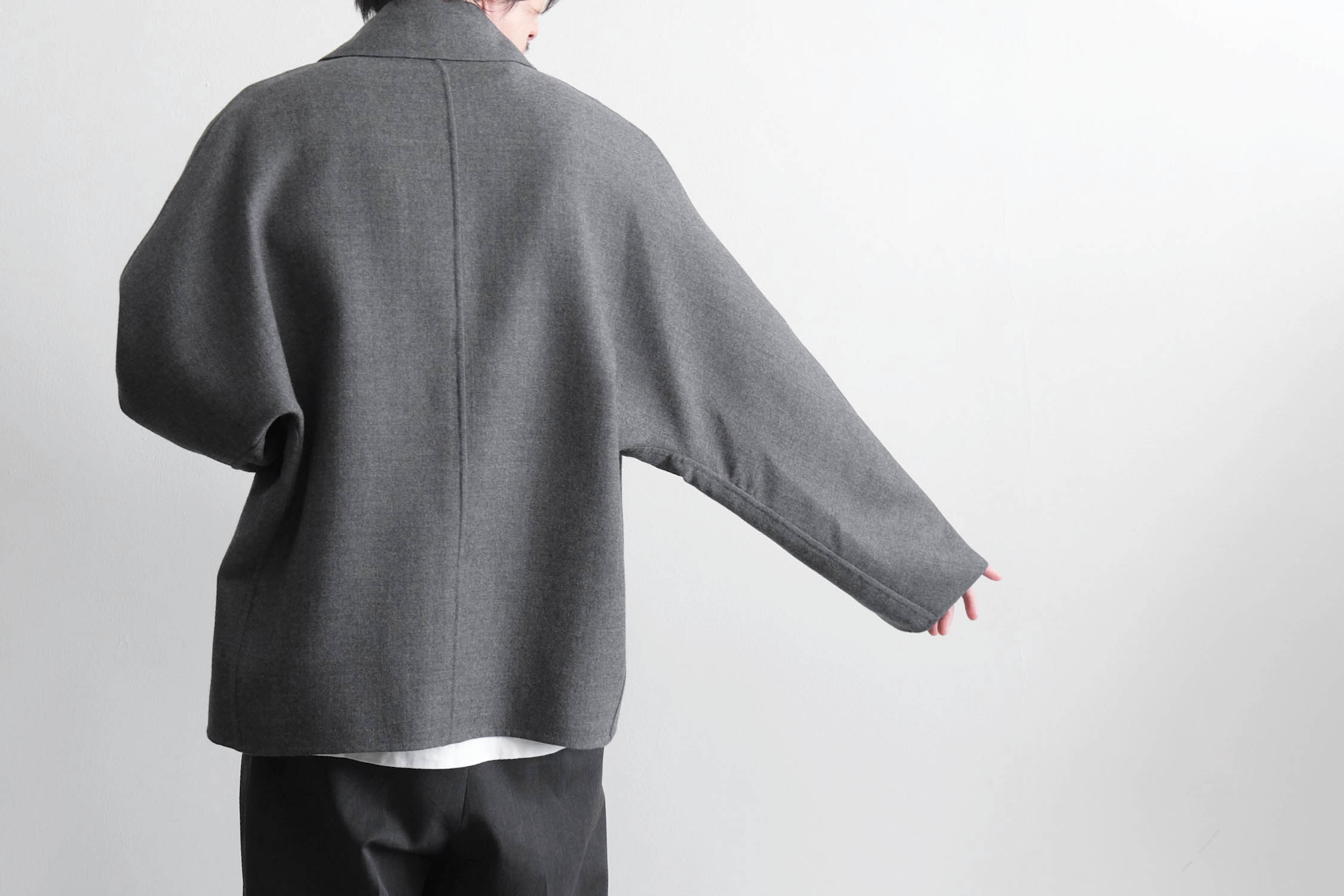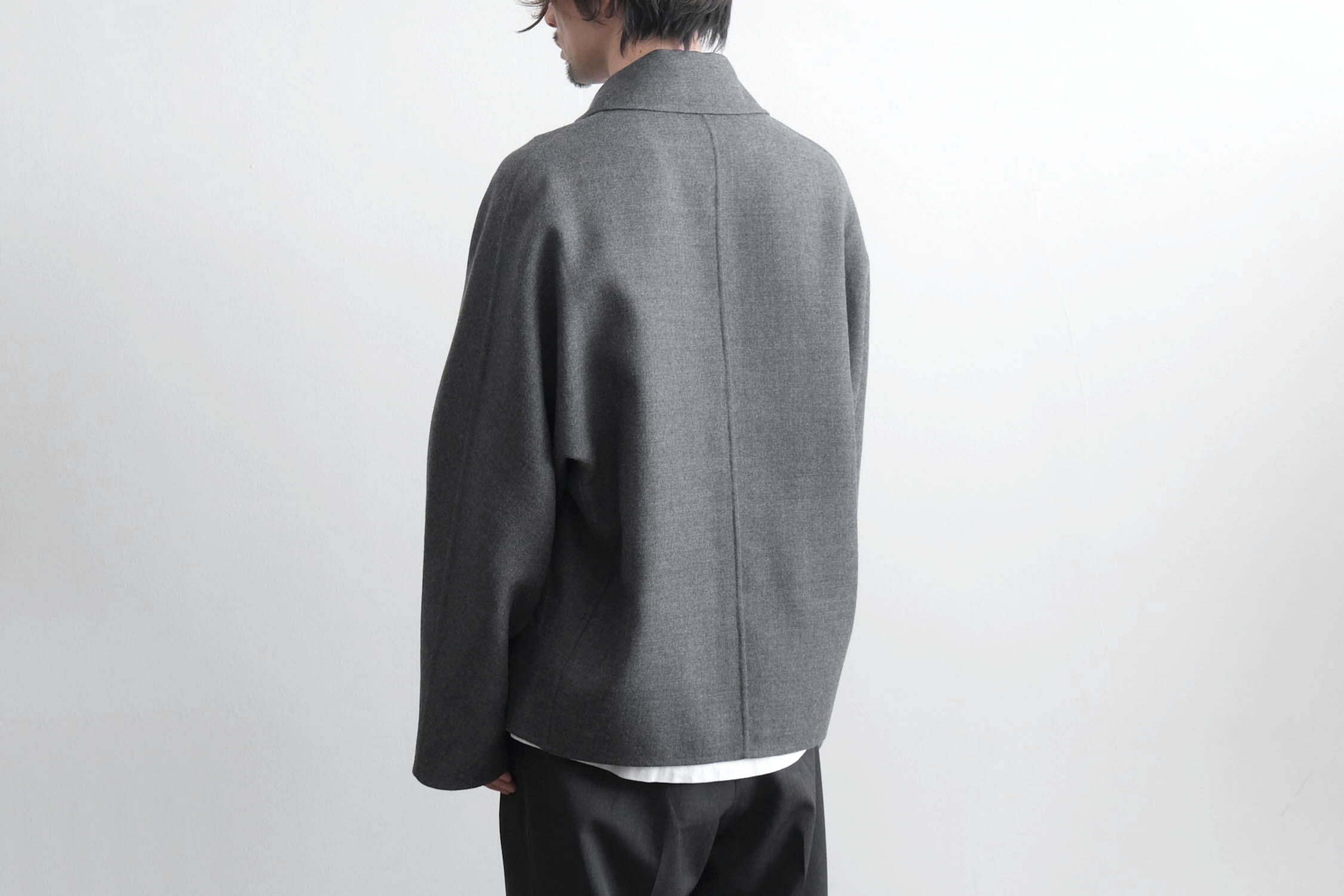 nonnotte - SUPER120S RIVER FLANNEL DRAPING KIMONO BLOUSON [CHARCOAL TOP]