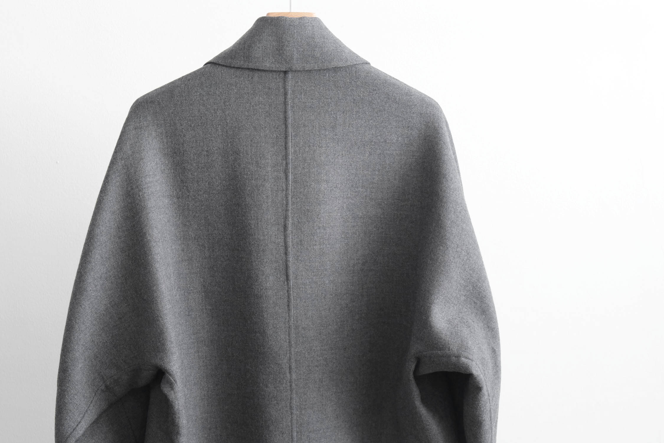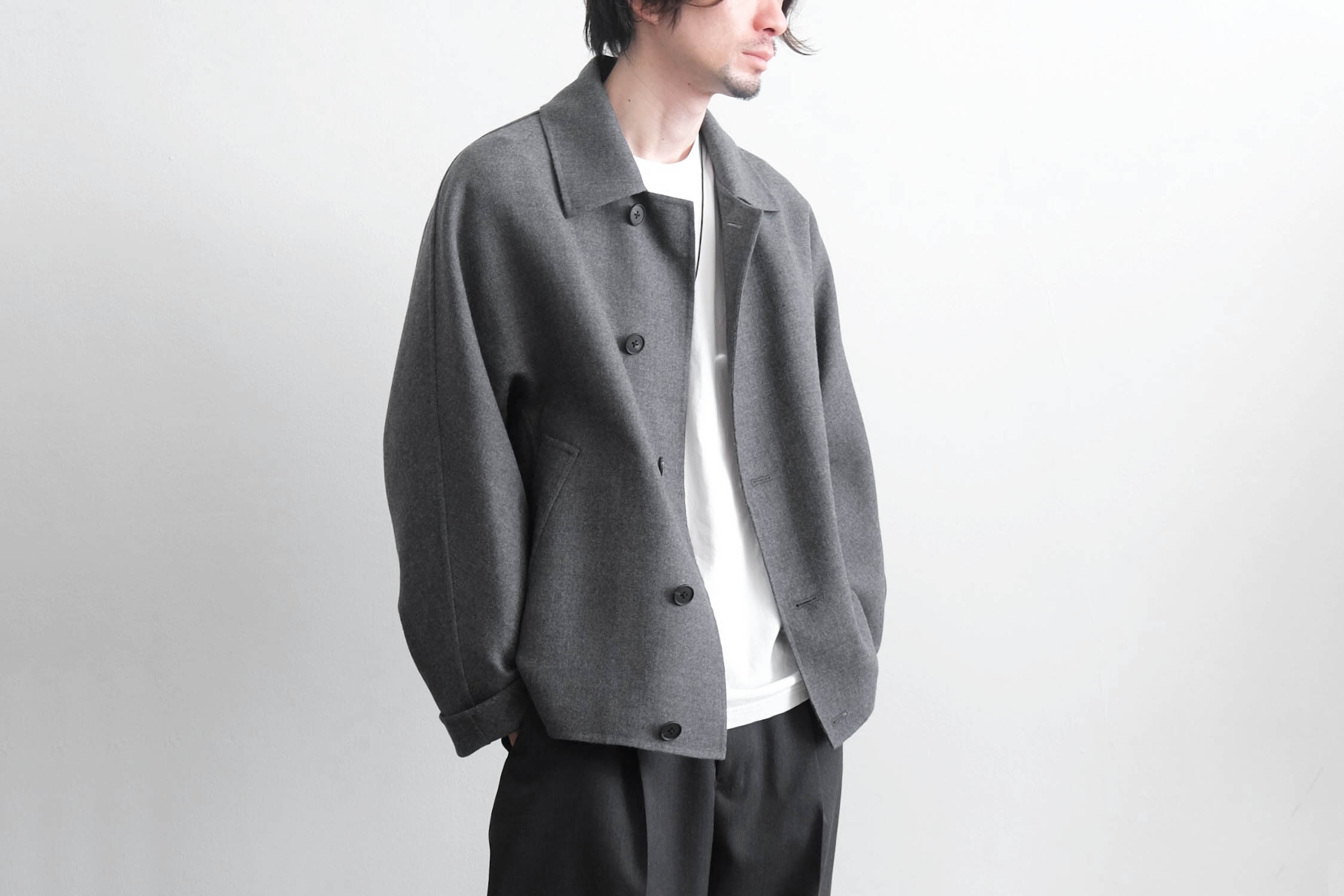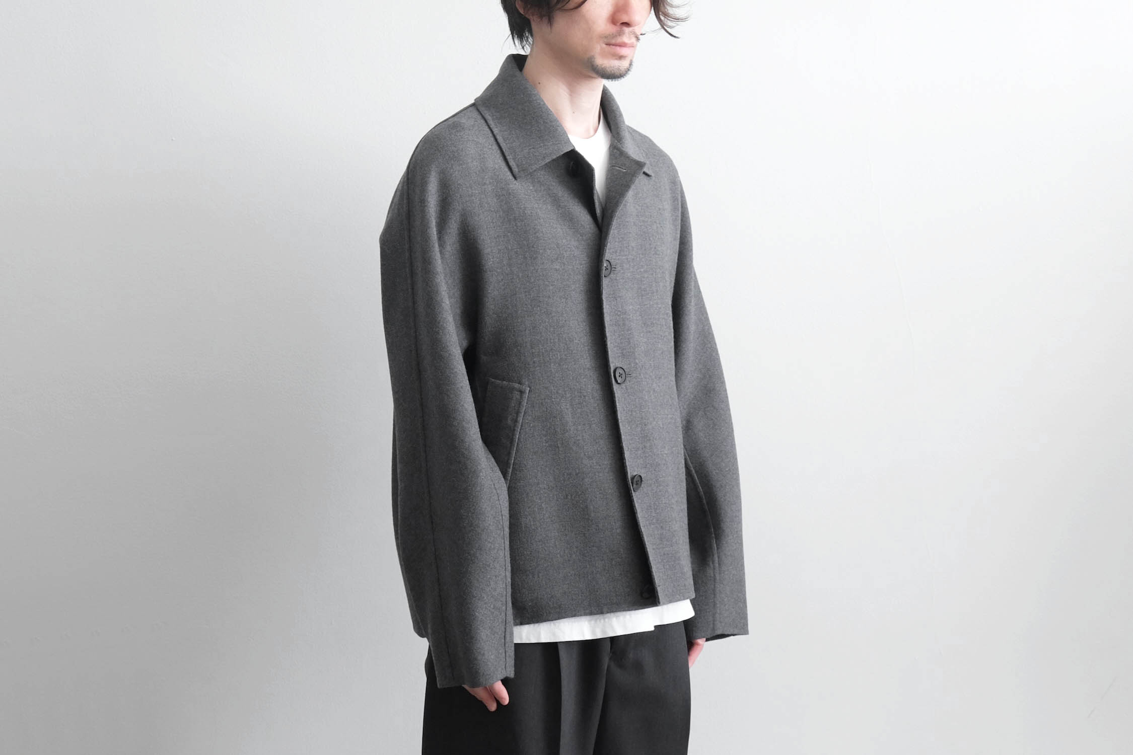 nonnotte - SUPER120S RIVER FLANNEL DRAPING KIMONO BLOUSON [CHARCOAL TOP]
