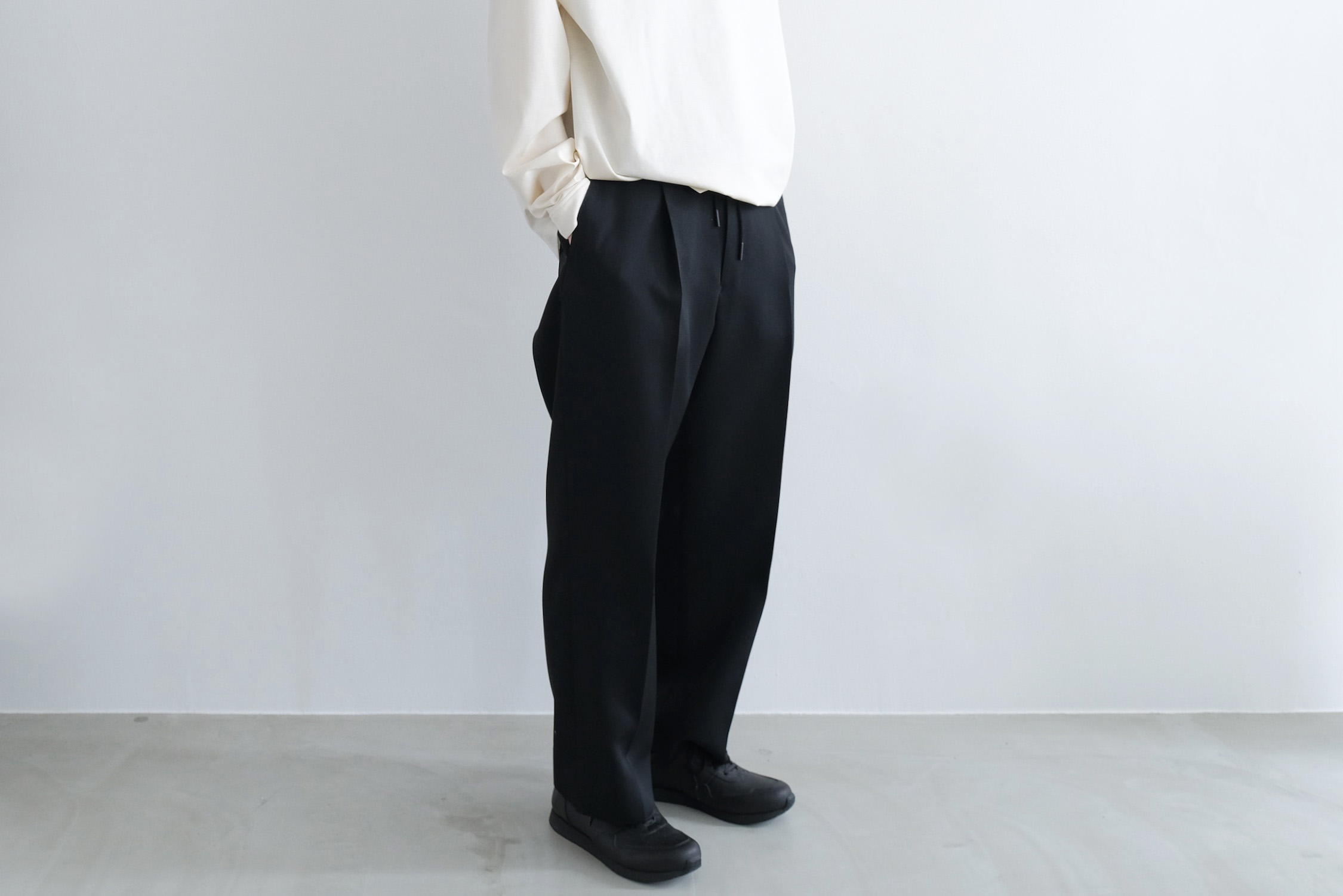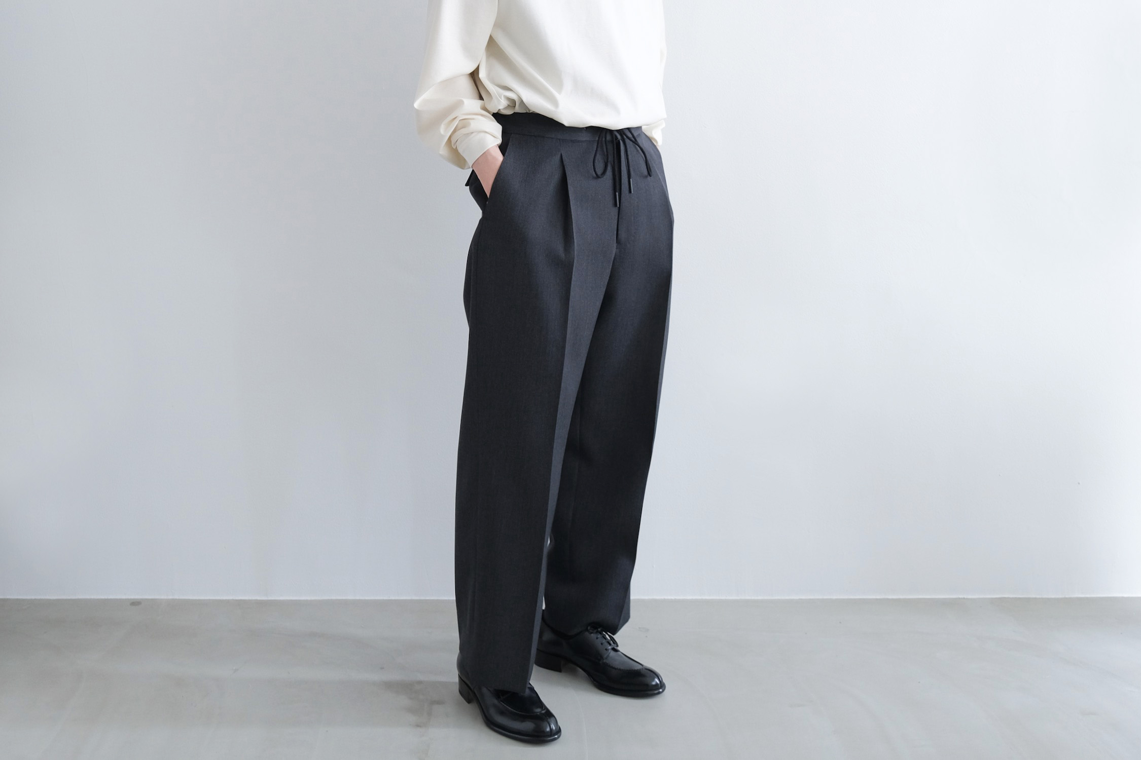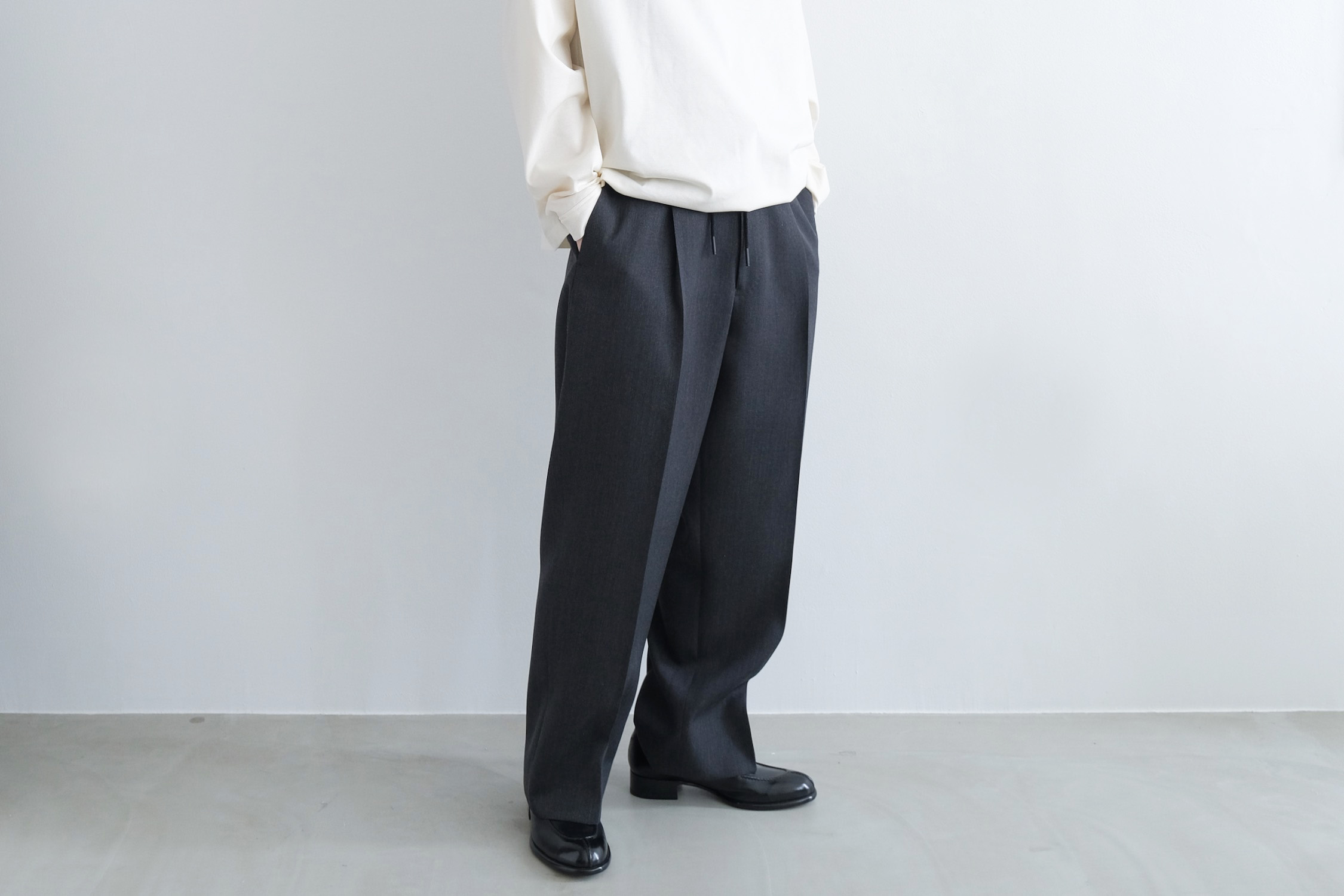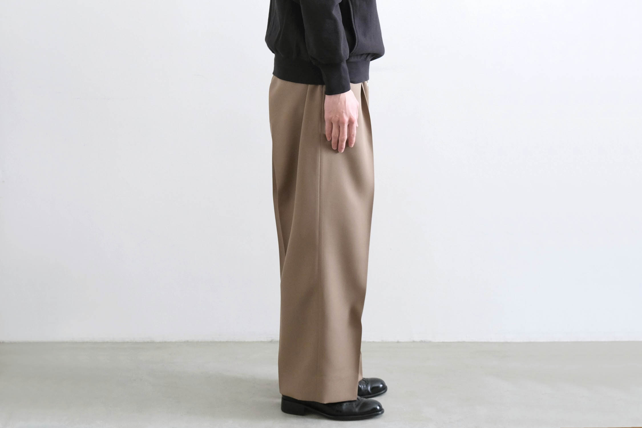 ワンタックの腰回りからズドンとストレートに落ちるワイドシルエット。