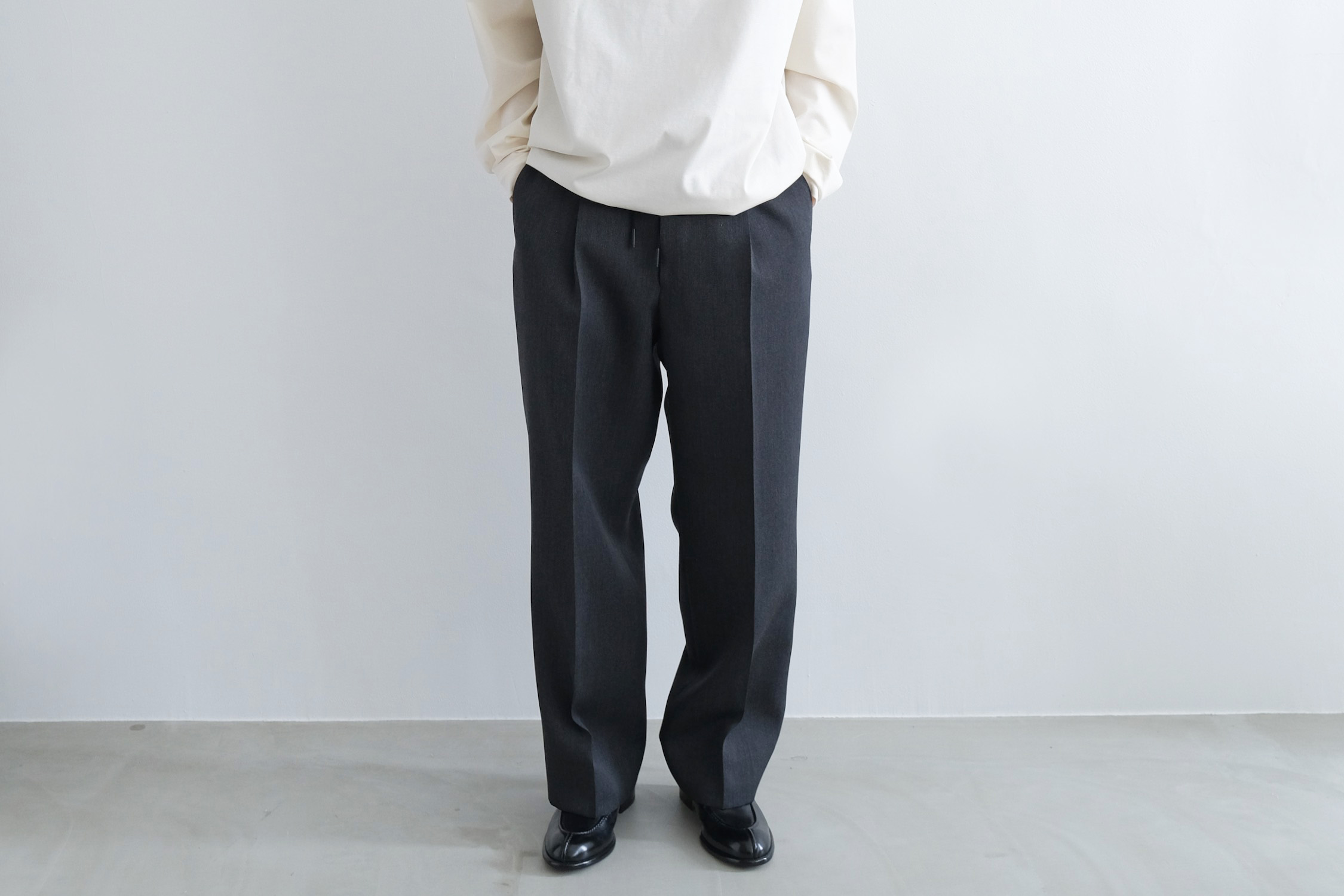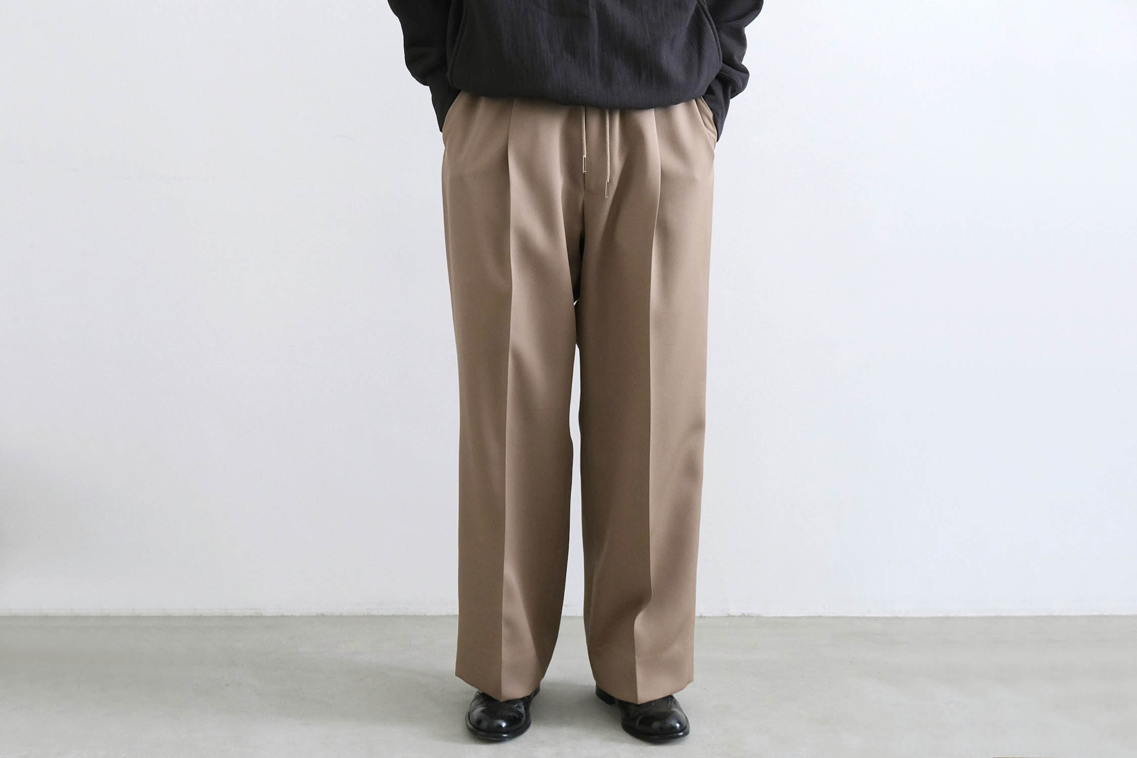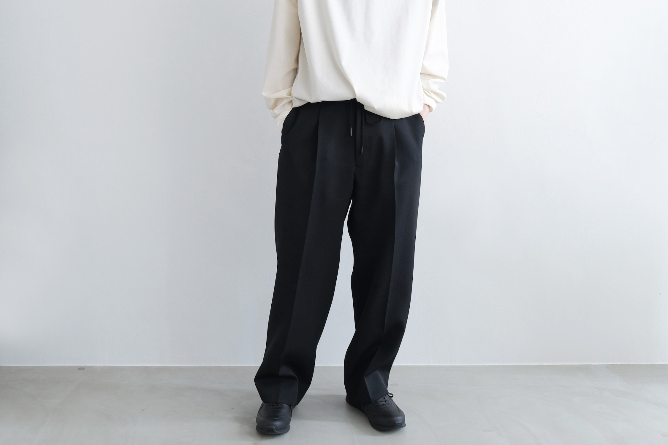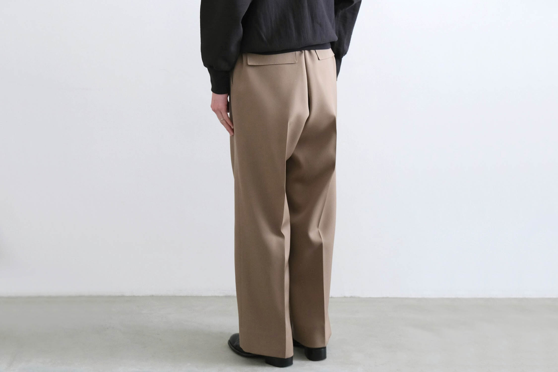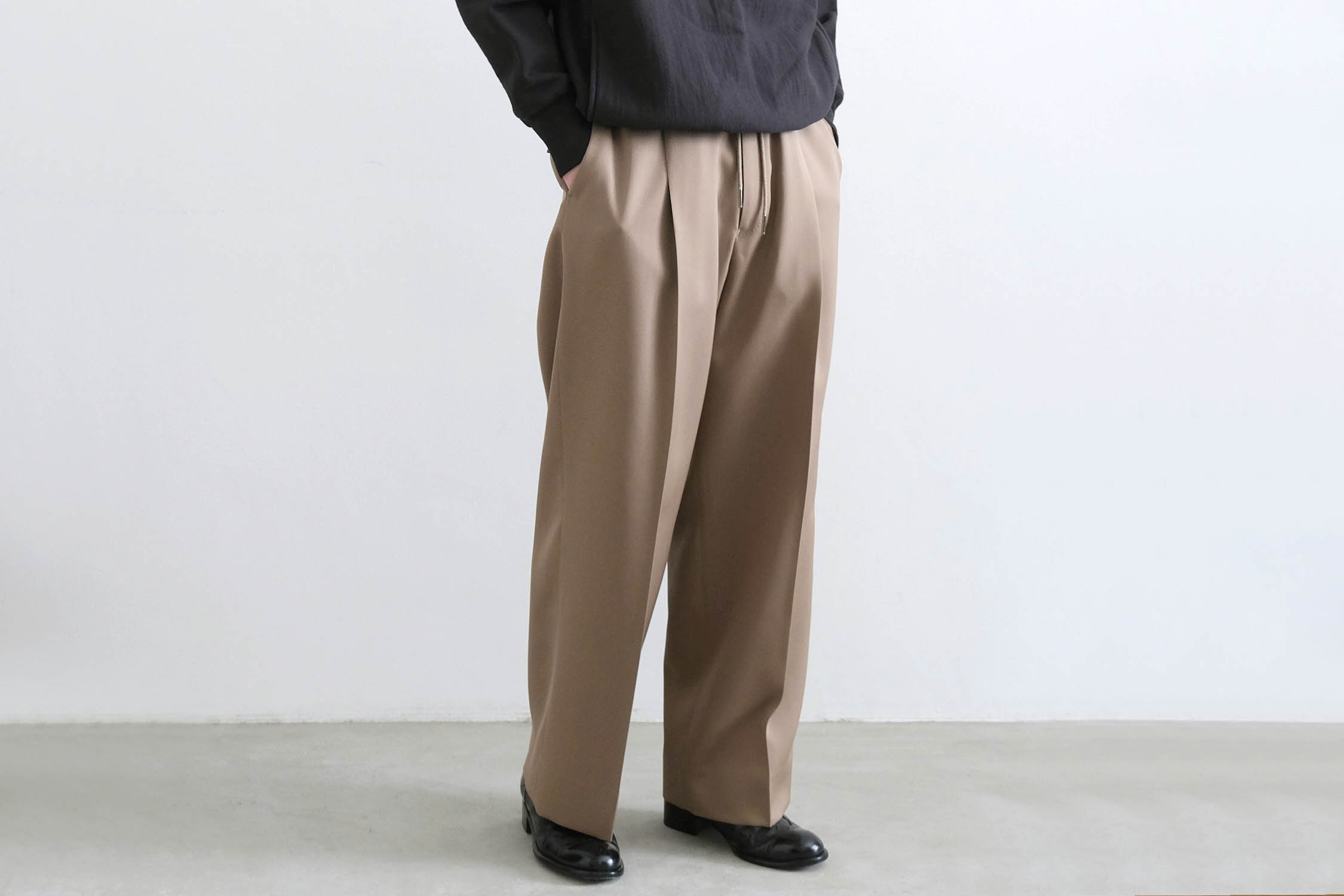ワンタックの腰回りからズドンとストレートに落ちるワイドシルエット。