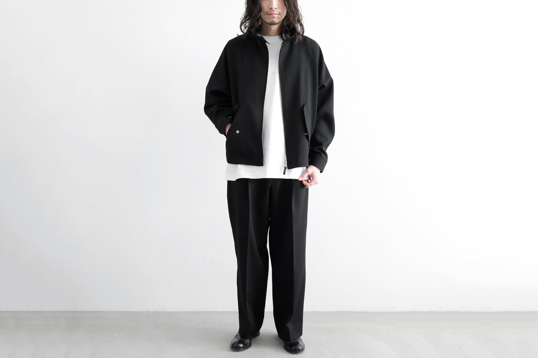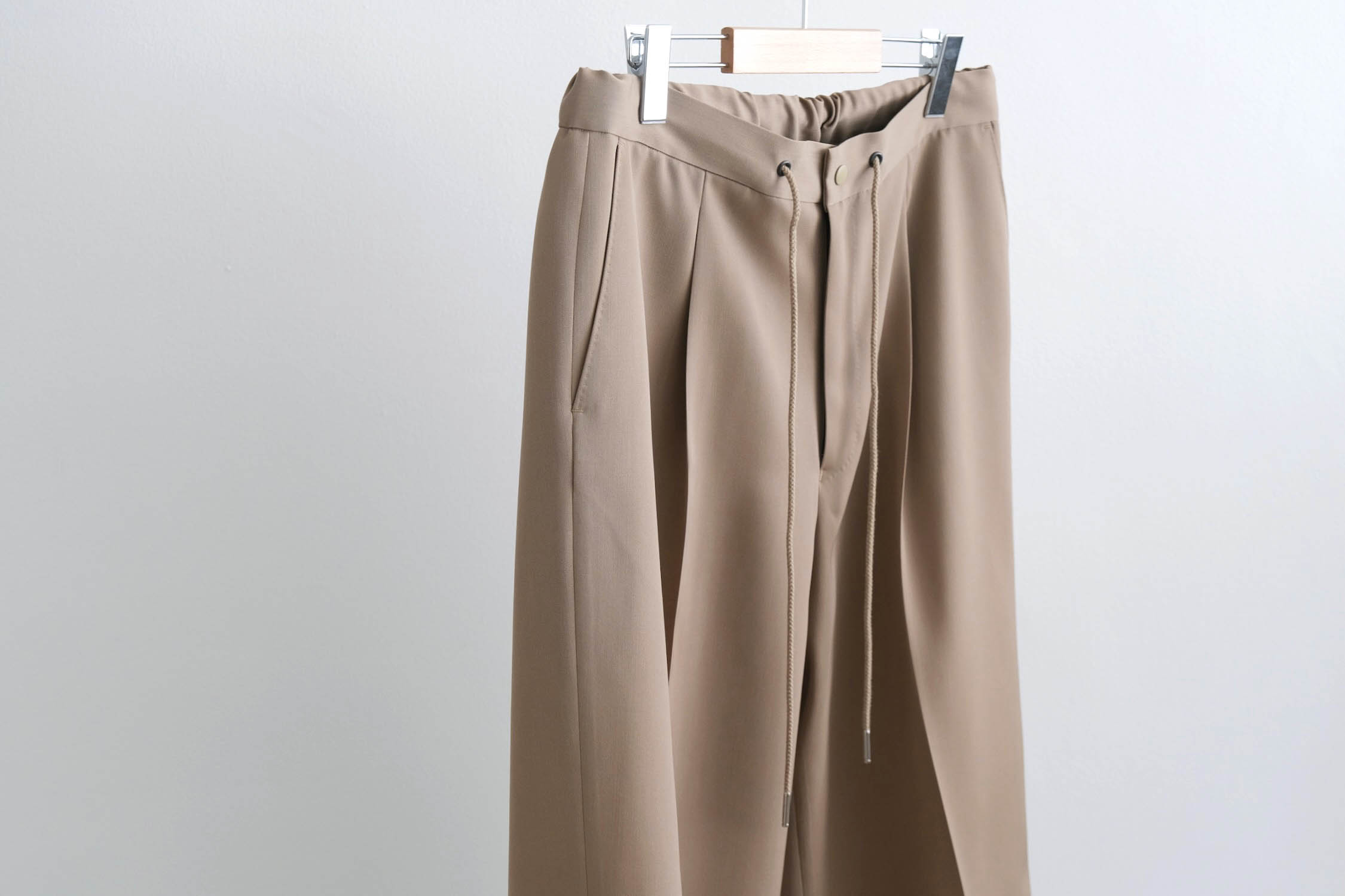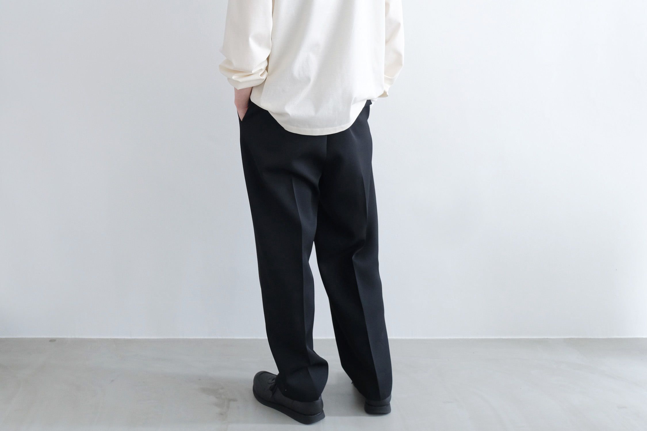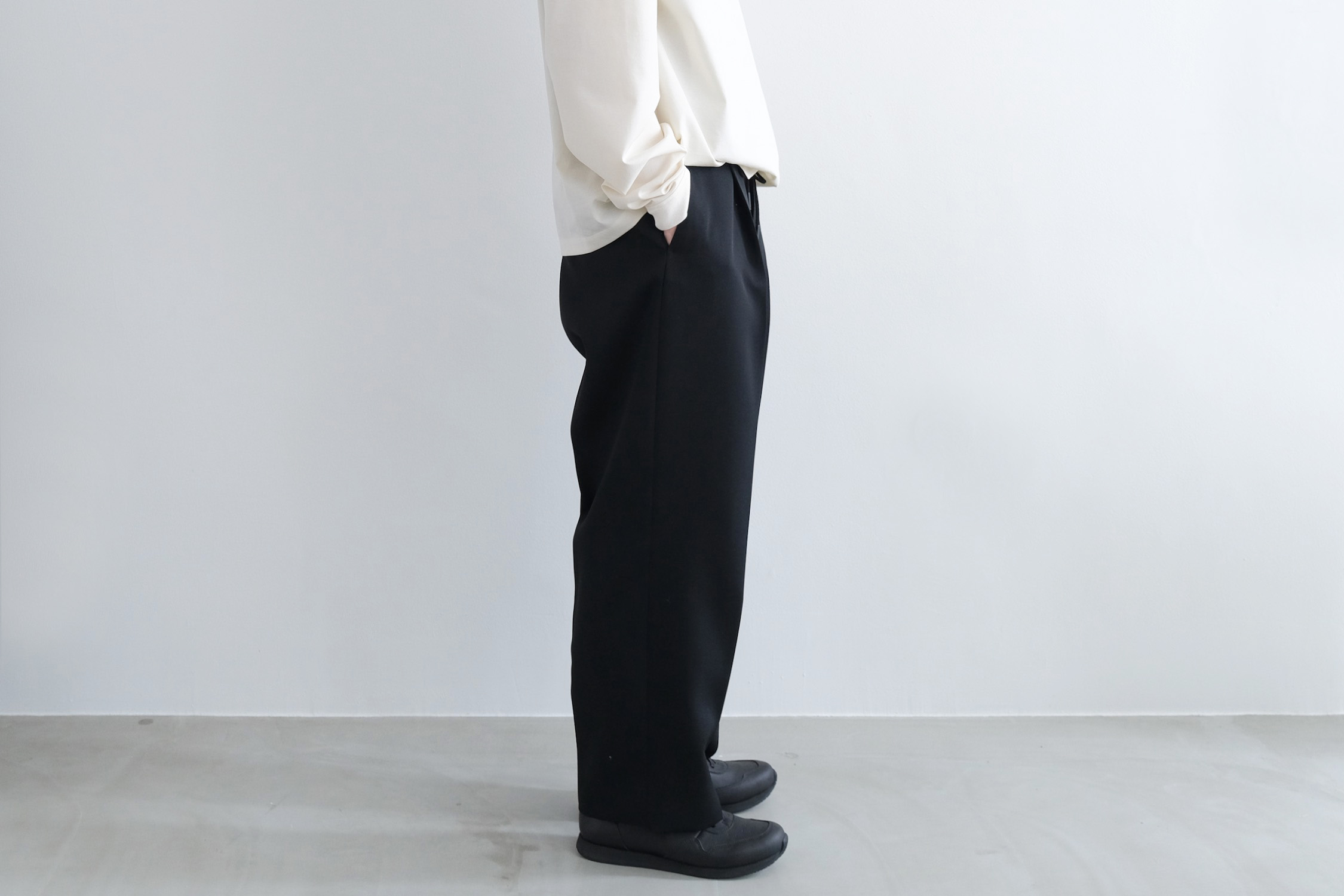ワンタックの腰回りからズドンとストレートに落ちるワイドシルエット。